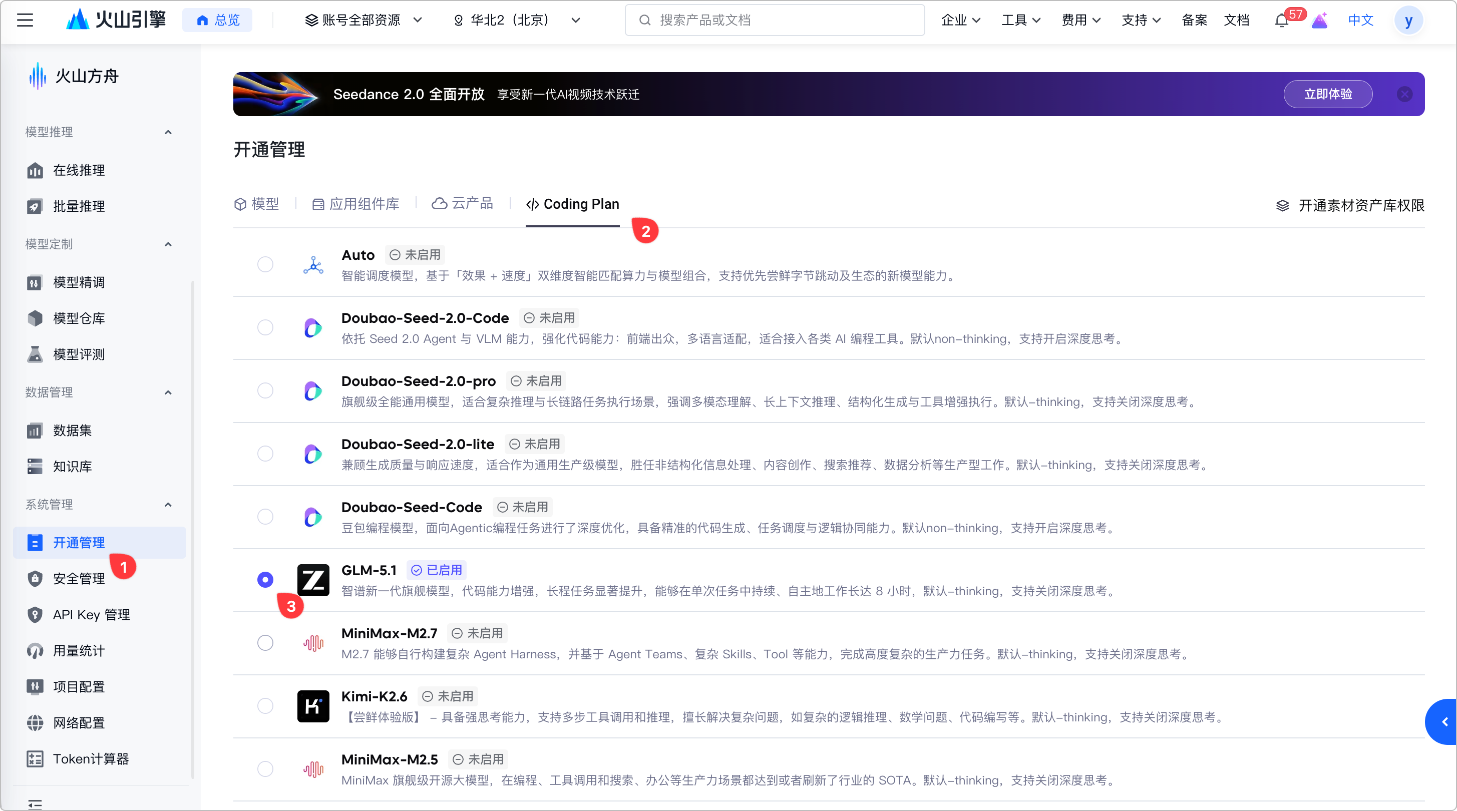 默认模型为 Auto 自动模式,如果要切换模型,可以前往火山方舟控制台「开通管理」中进行切换: