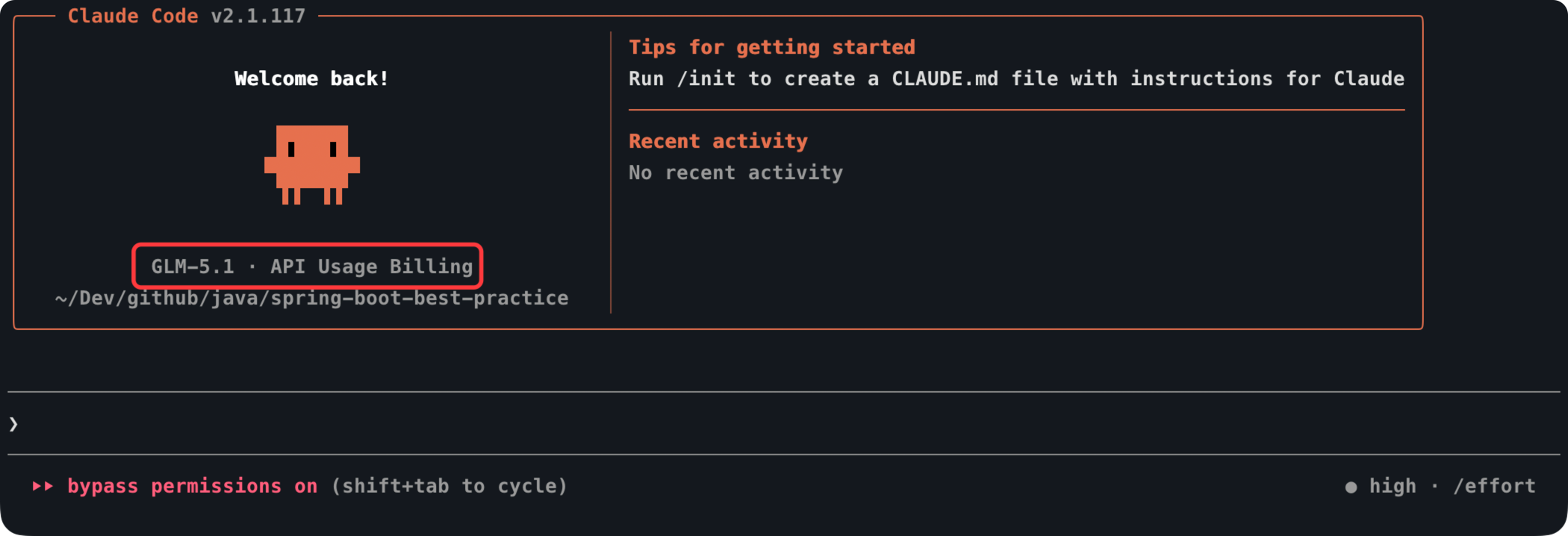 在任意项目目录下执行 claude 命令,Claude Code 启动成功后,终端上会显示使用的是对应的编程模型。