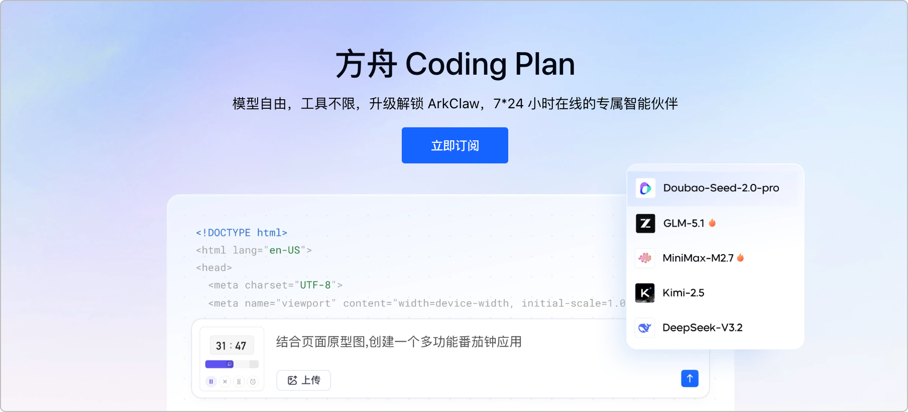 方舟 Coding Plan 支持 Doubao、GLM、DeepSeek、Kimi、MiniMax 等模型,工具不限,订阅越多越划算!