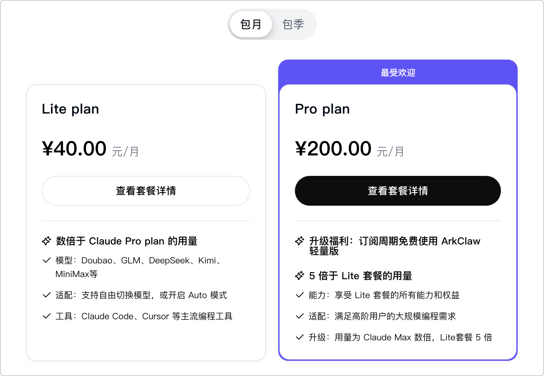 多种套餐适配不同场景:提供 Lite 与 Pro 套餐,适应普通与高强度编程场景。