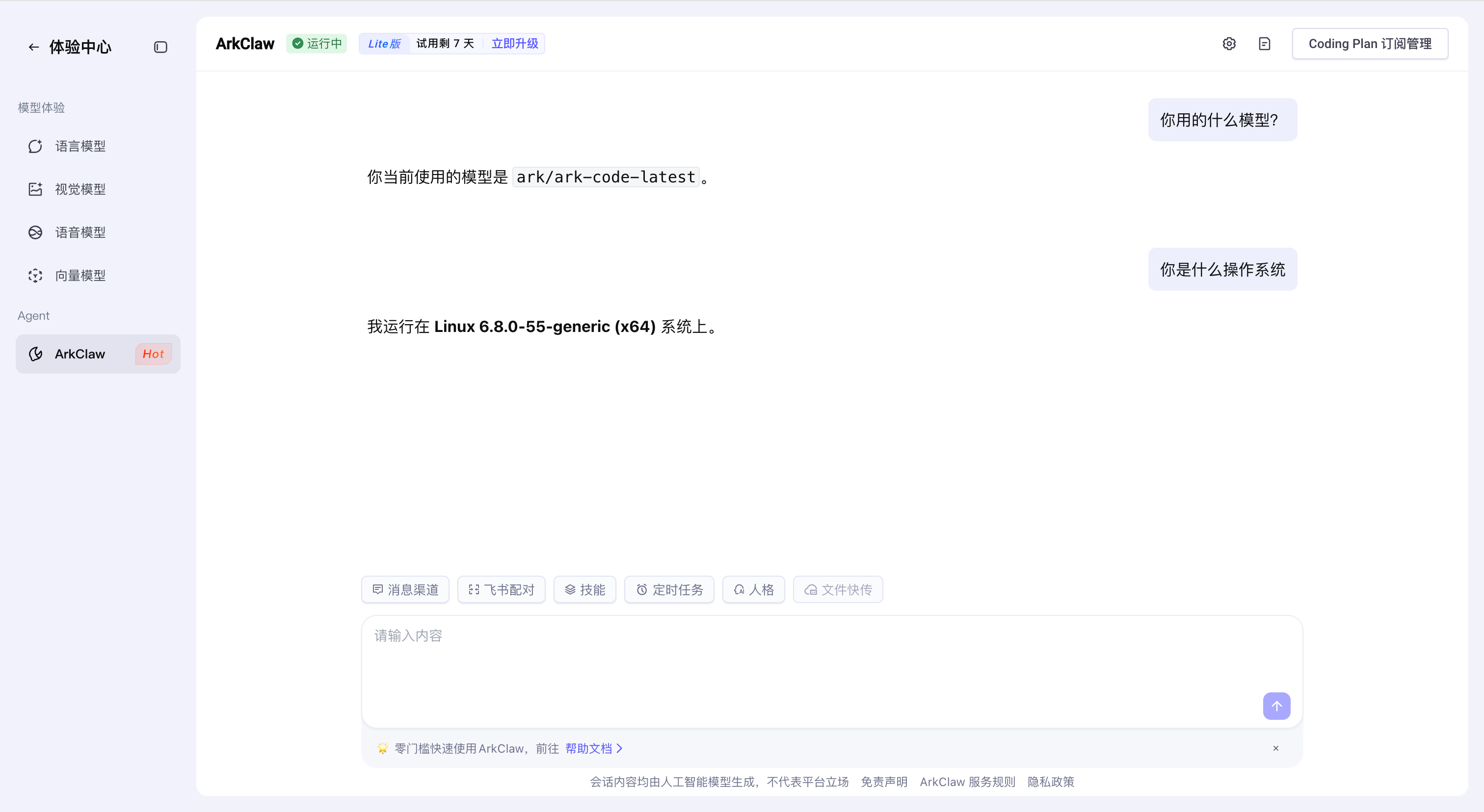 我们可以直接在 ArkClaw 的对话页面与它进行对话了: