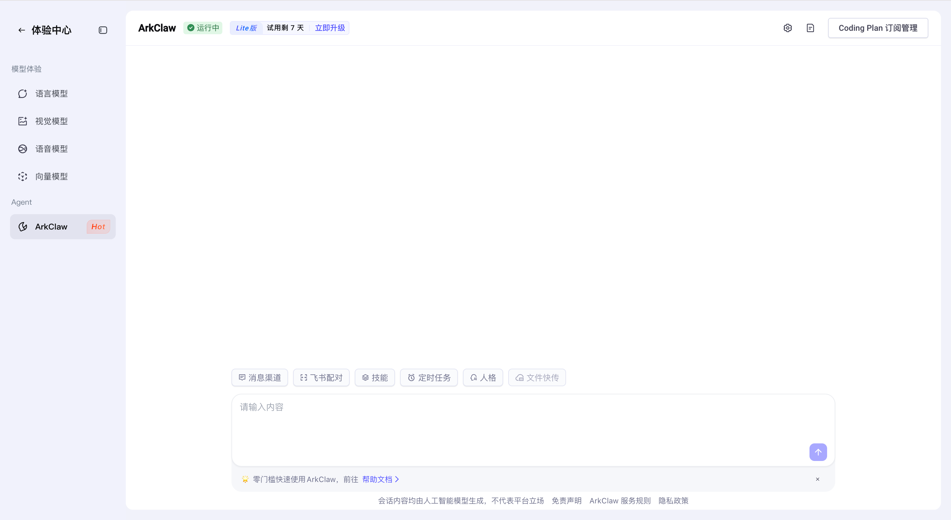 - Coding Plan Lite 订阅用户,免费体验 7 天 ArkClaw 使用权益;