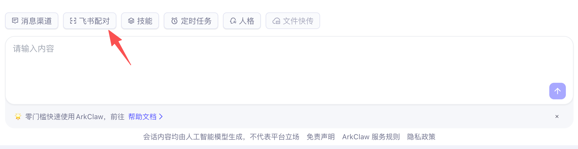 回到 ArkClaw 对话页面,点击 “飞书配对” 按钮: