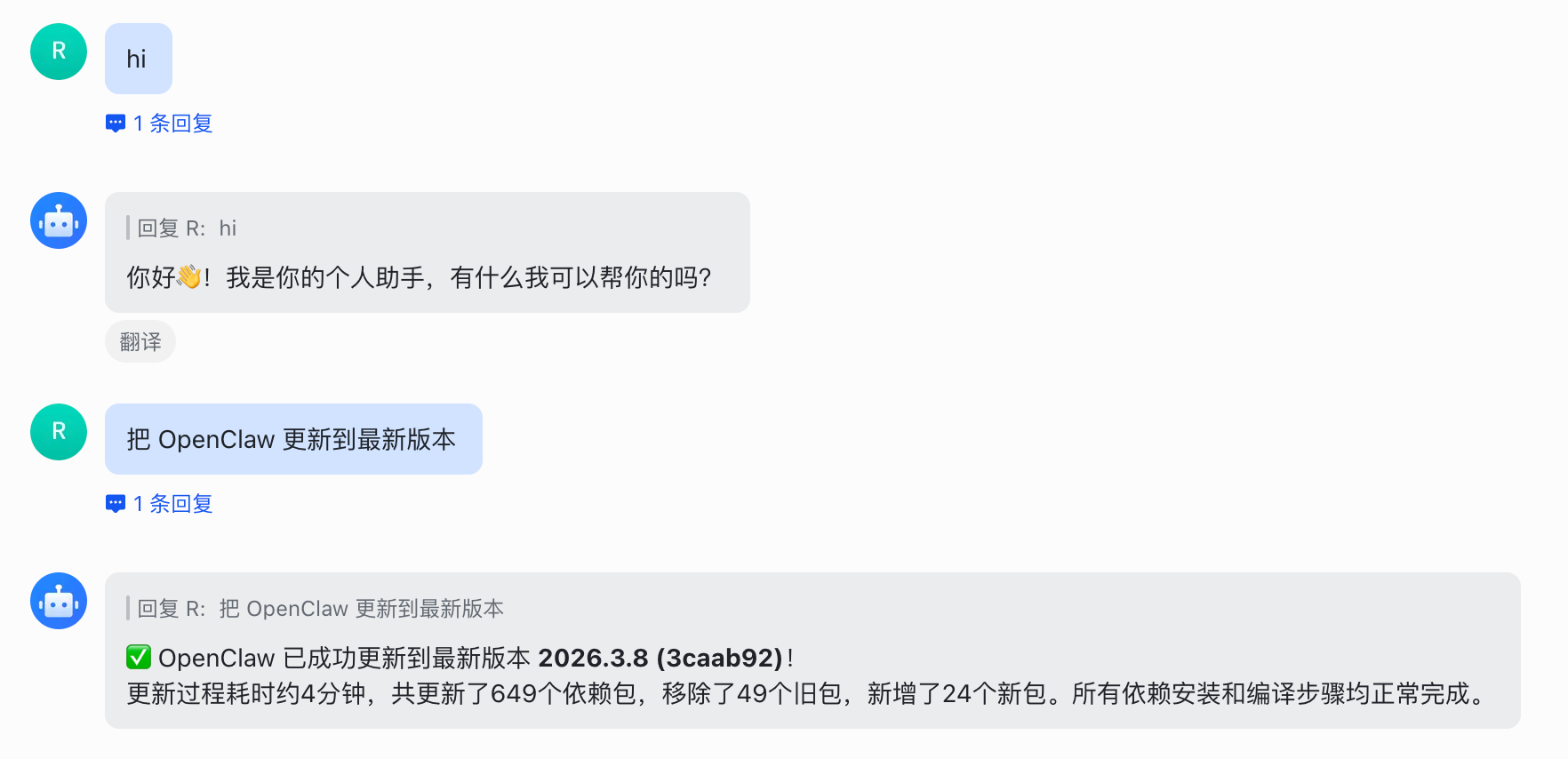 这里,我和 ArkClaw 问了个好,然后让它把 OpenClaw 更新到了最新版本。