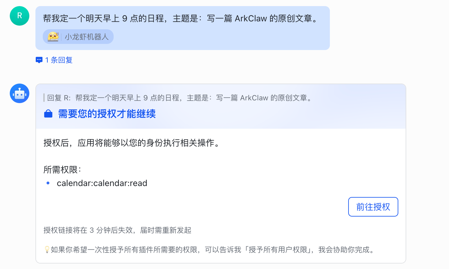 先演示一个让 ArkClaw 创建飞书日程的场景,比如: