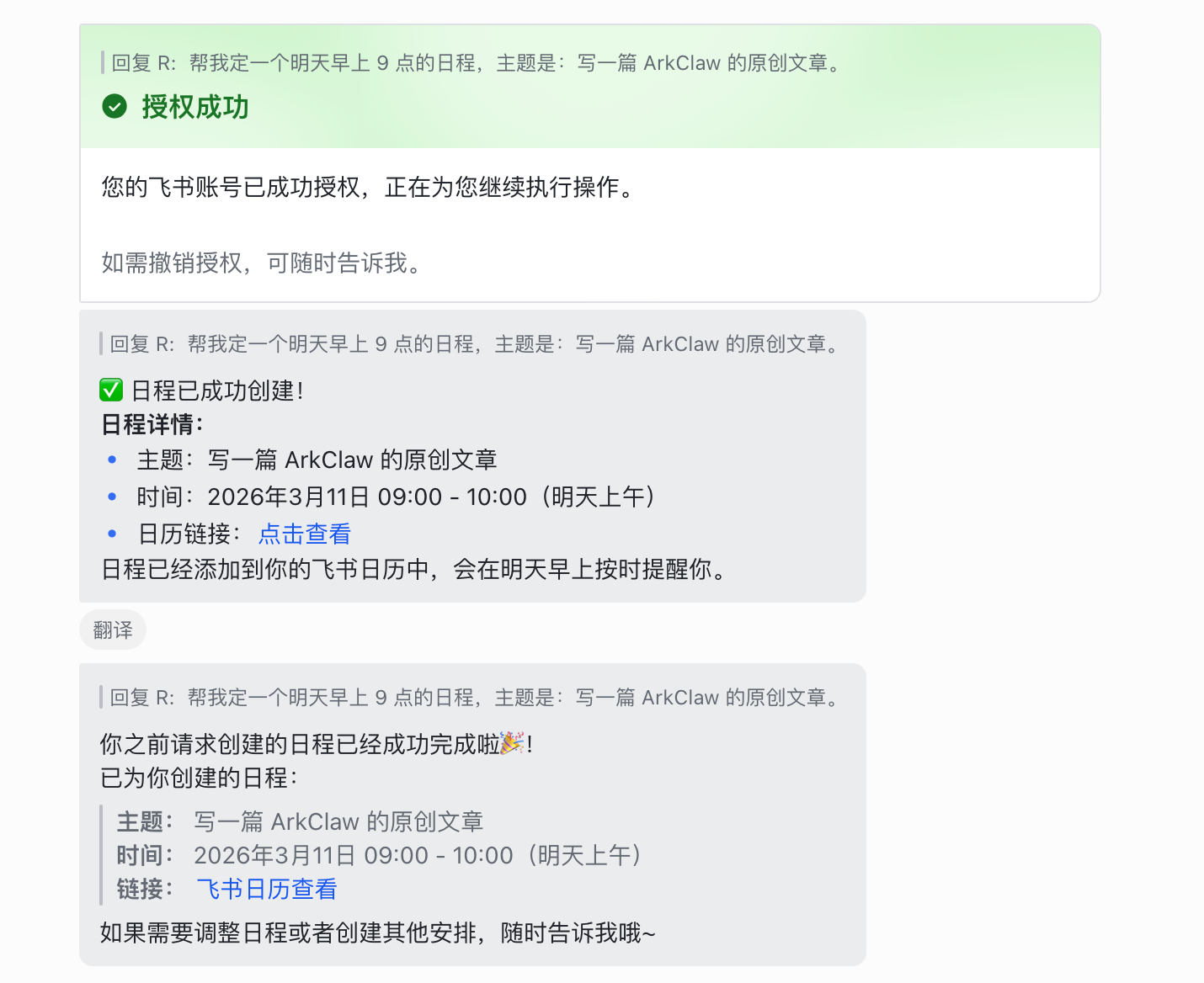 如果没有授权过,会要求授权,点击授权后会弹出飞书授权页面,完成授权后就可以看到日程已经创建成功了: