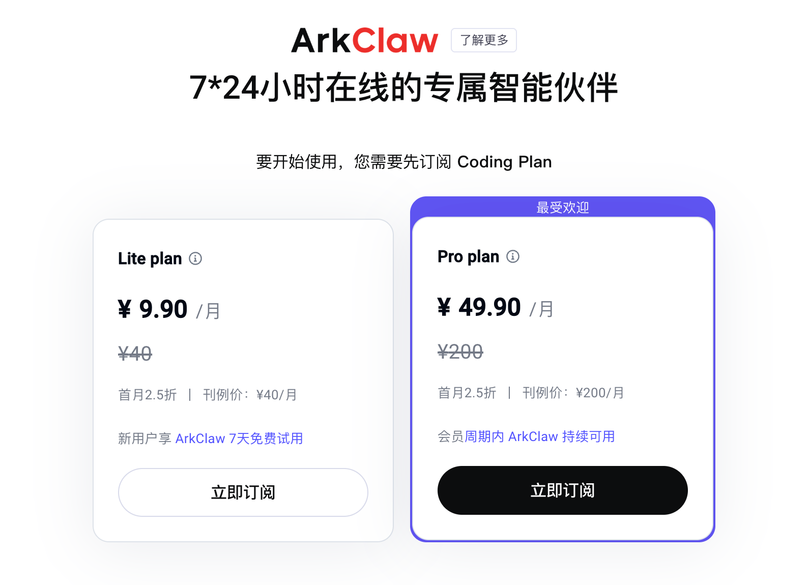 Lite & Pro Plan 订阅用户都可以免费使用 ArkClaw: