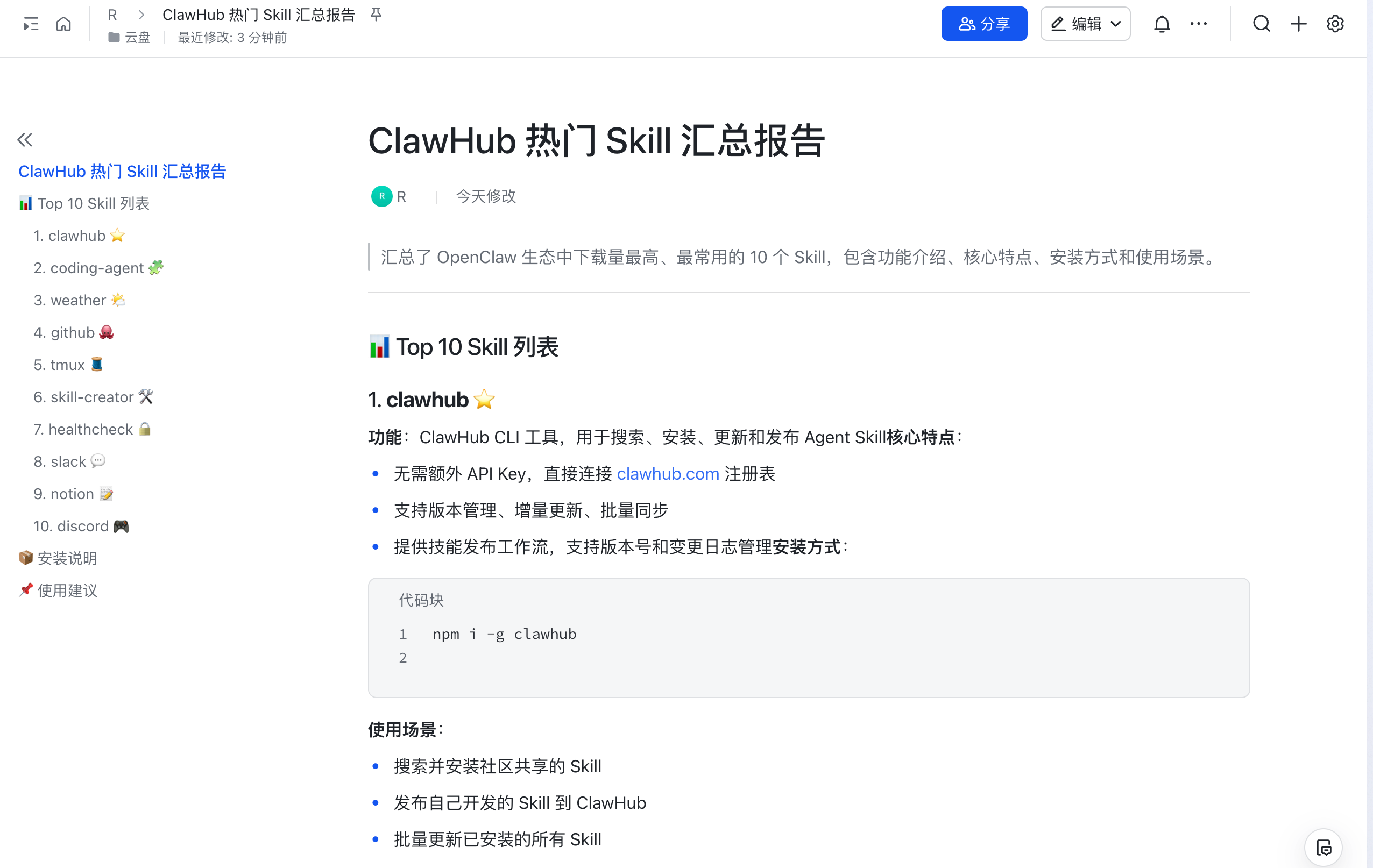 帮我调研下 ClawHub 中下载量最多的前 10 个 Skill,将它们的功能、特点、安装方式等信息汇总为一个飞书文档。