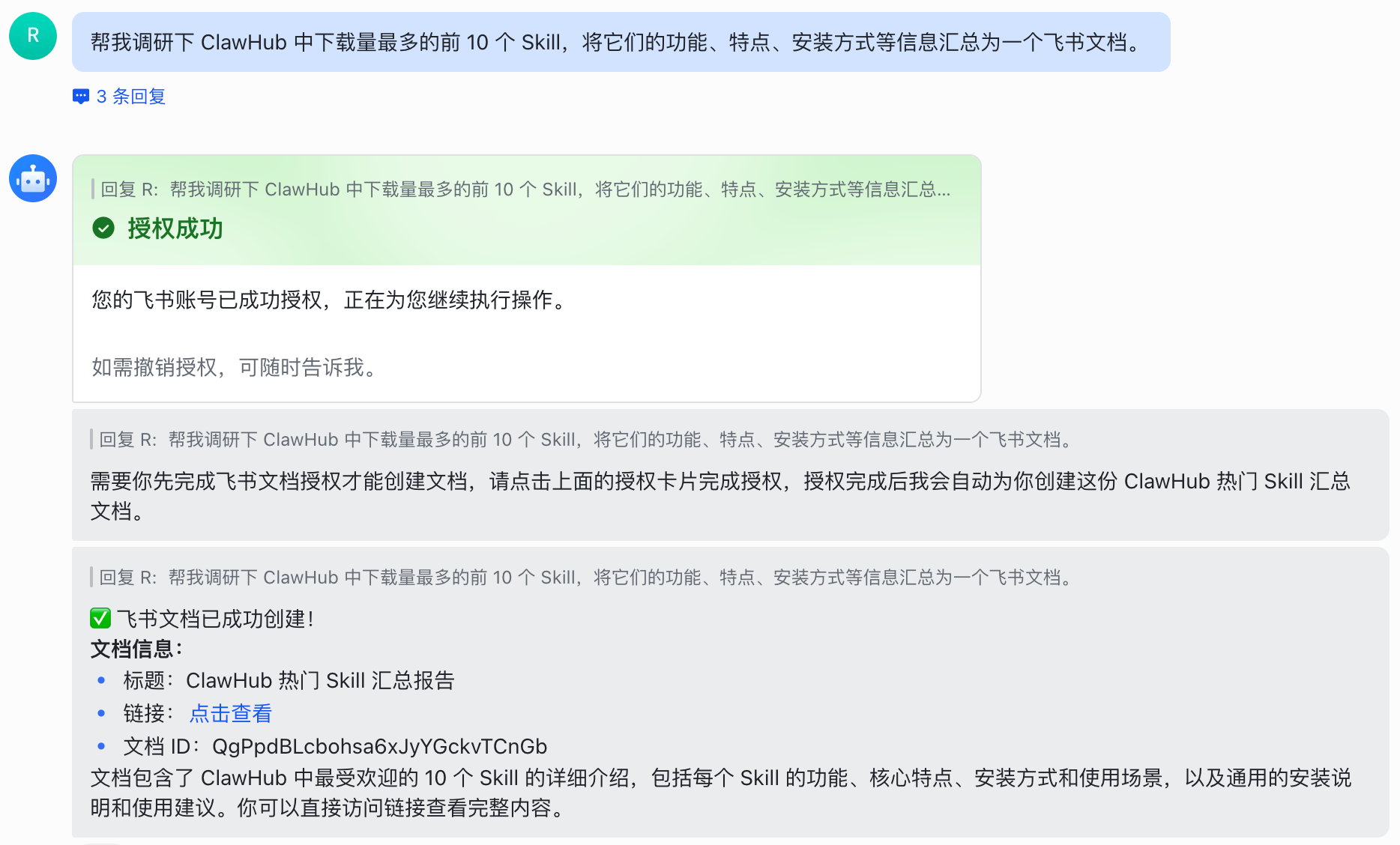 在授权成功后,它就会自动创建一个飞书文档,并将调研结果保存到这个文档里了。