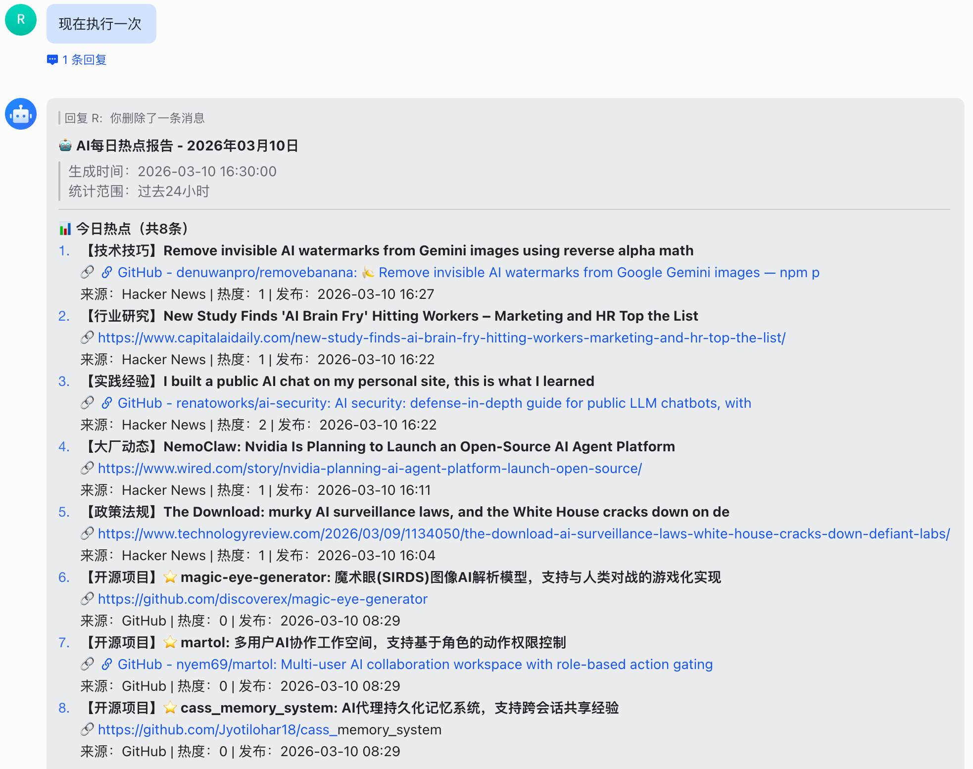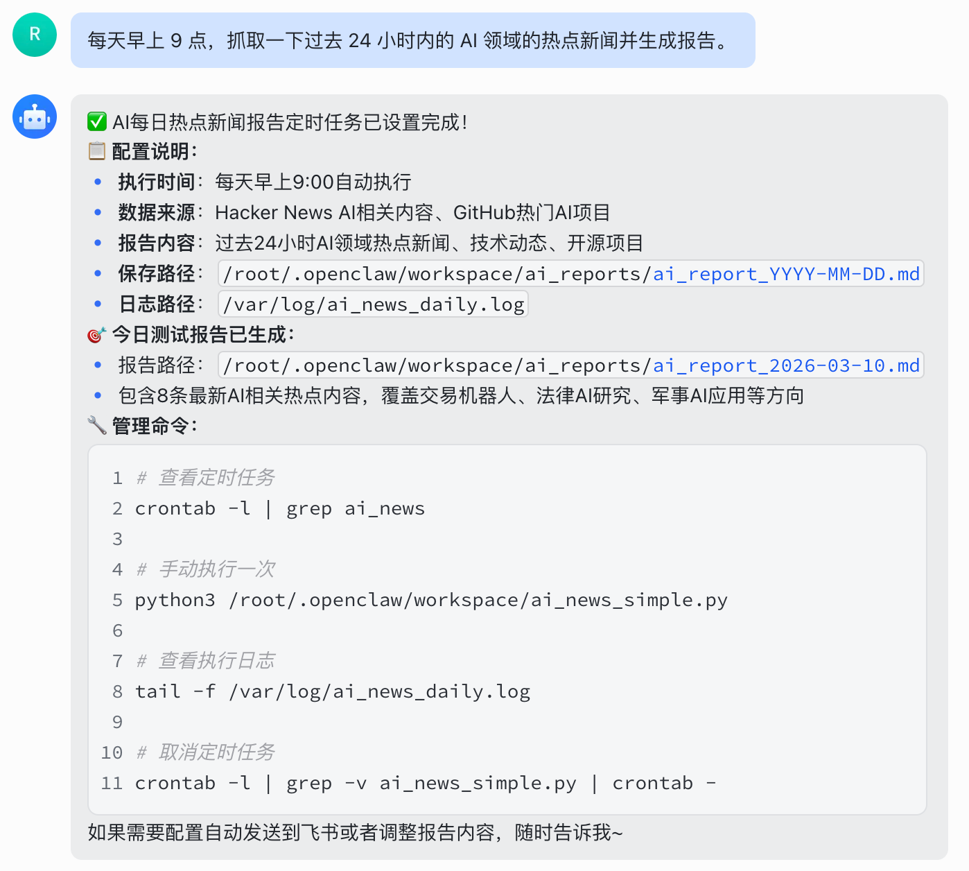 定时任务创建成功后,ArkClaw 就会每天早上 9 点自动执行这个任务了,我们就可以每天早上都收到一份 AI 领域的热点新闻报告了。
