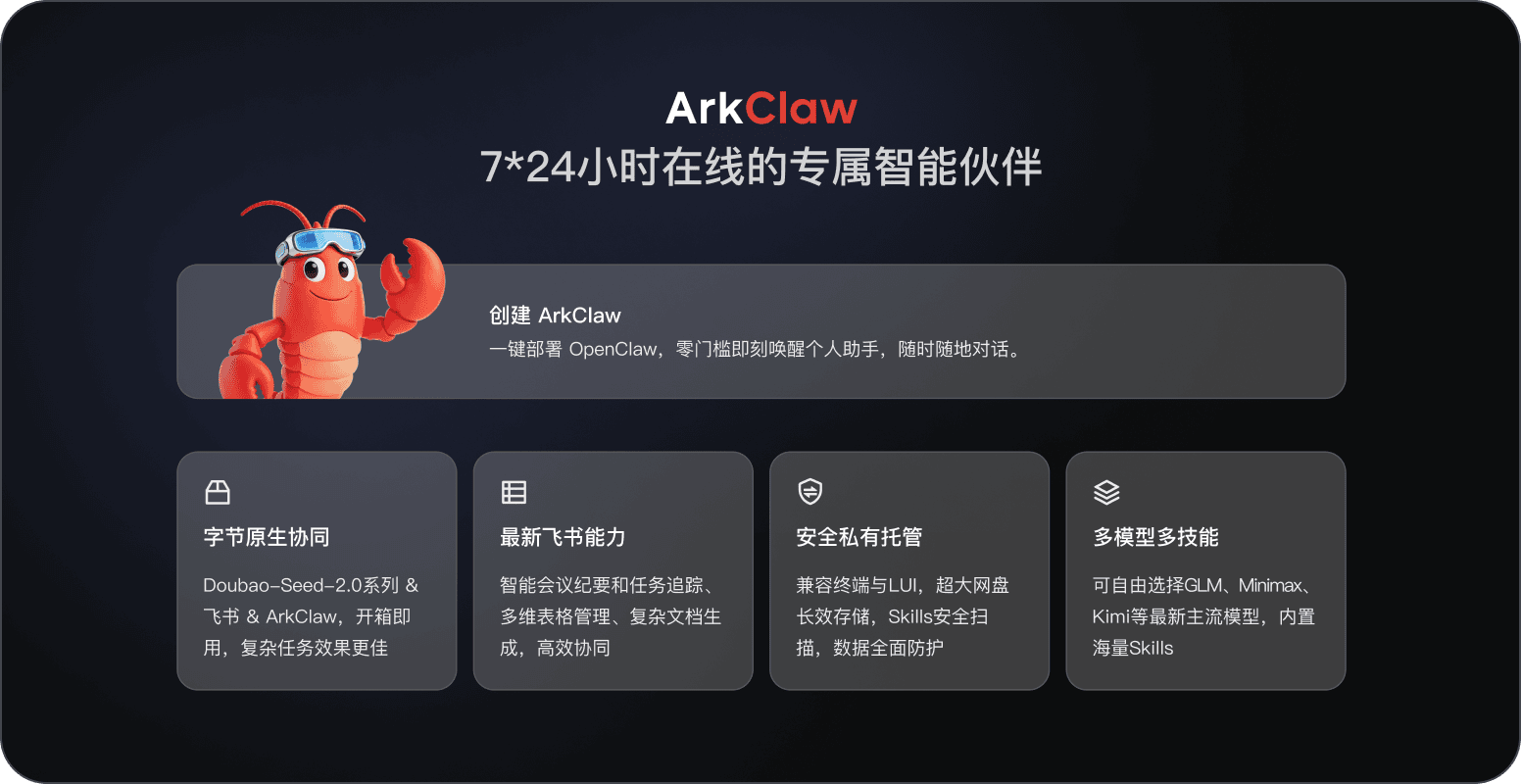 - 更亲和飞书生态:专属飞书插件(火山 ArkClaw 独家优势),轻松处理日程安排和提醒、会议总结预定、复杂文档/表格处理,一键接入飞书专属 Skills;并内置网盘长效存储,LUl & Terminal 兼容模式,灵活易用;