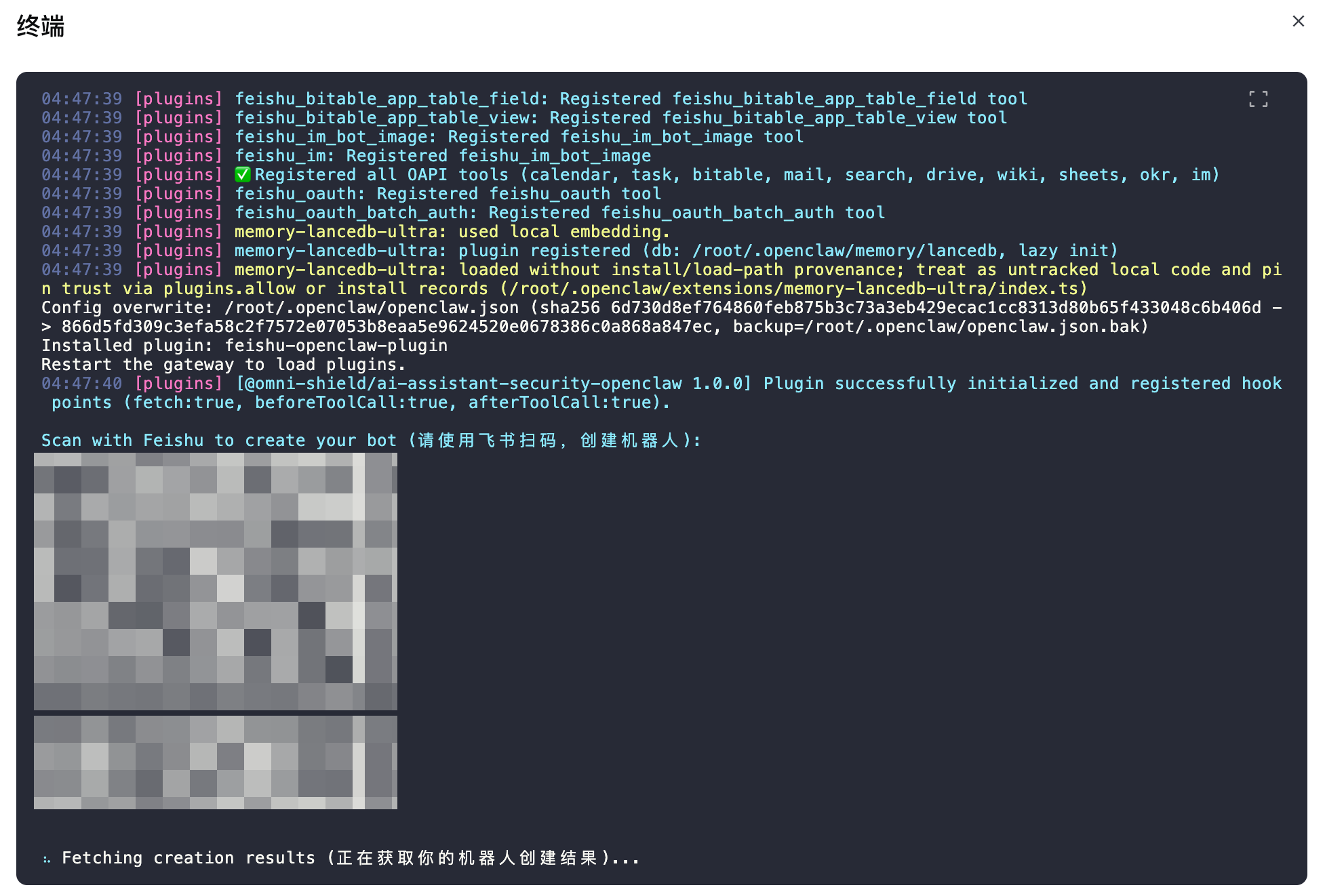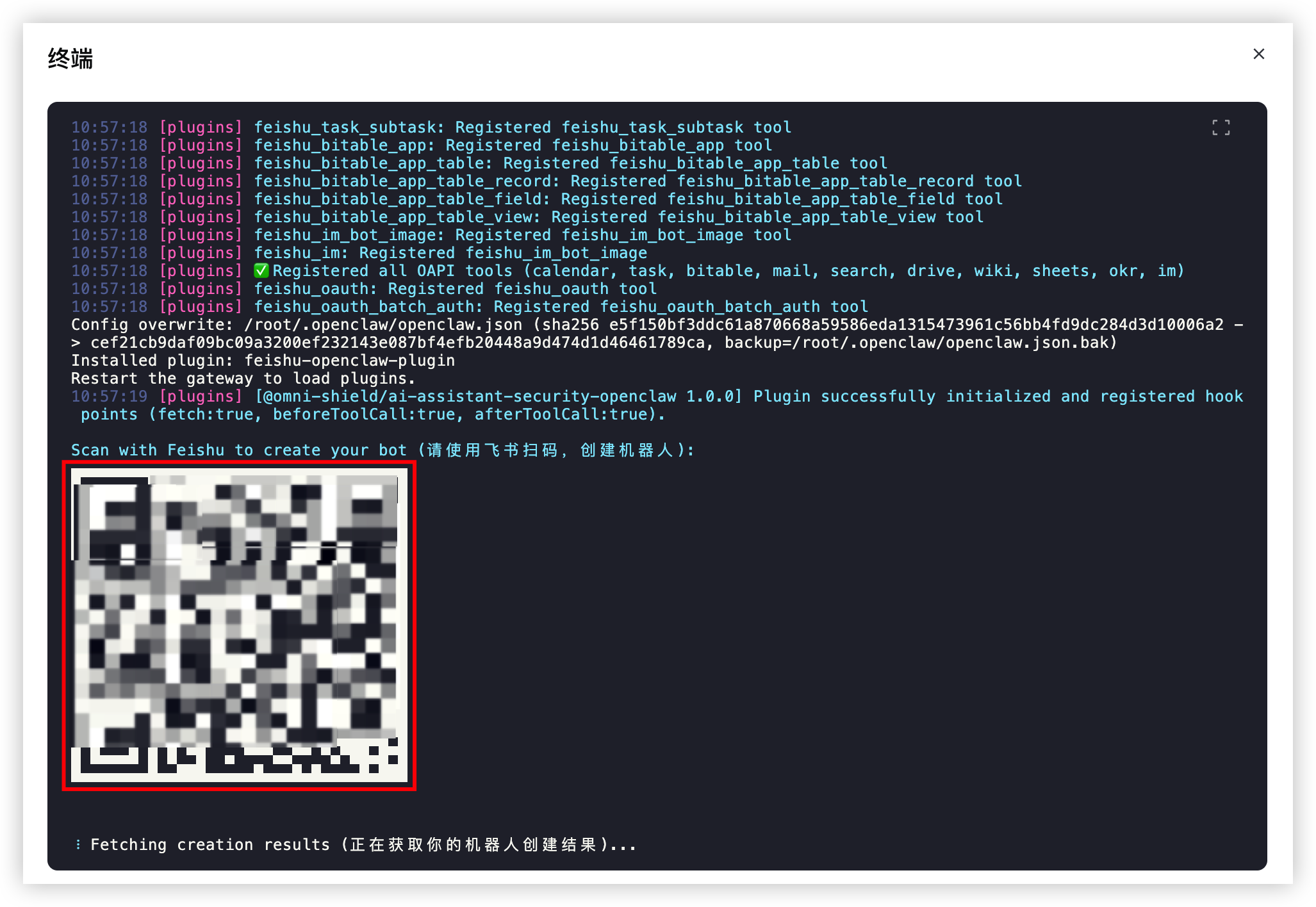 等待终端命令执行完成,会展示创建飞书机器人二维码:
