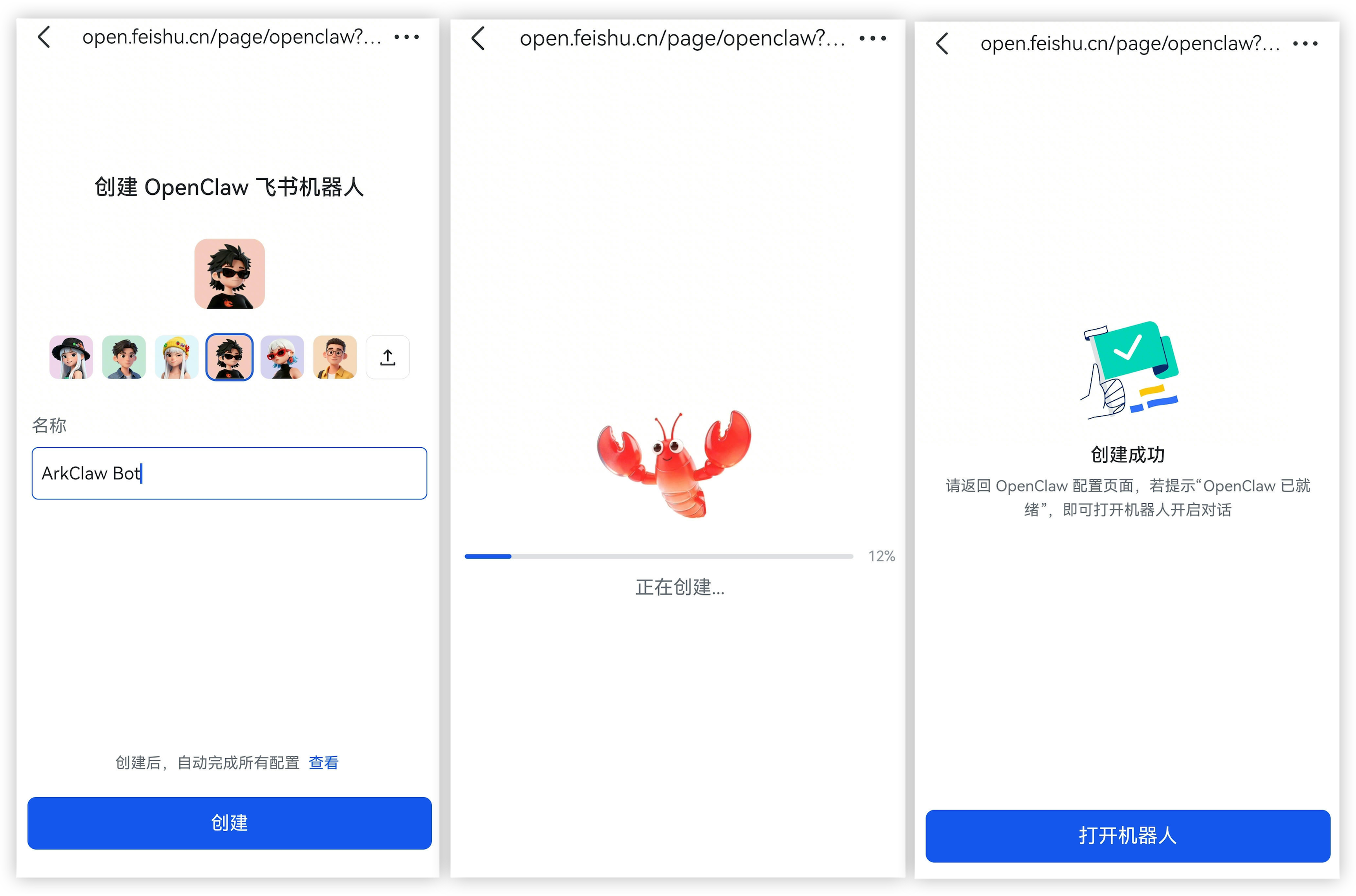 机器人创建成功后,ArkClaw 会自动配置新建机器人信息: