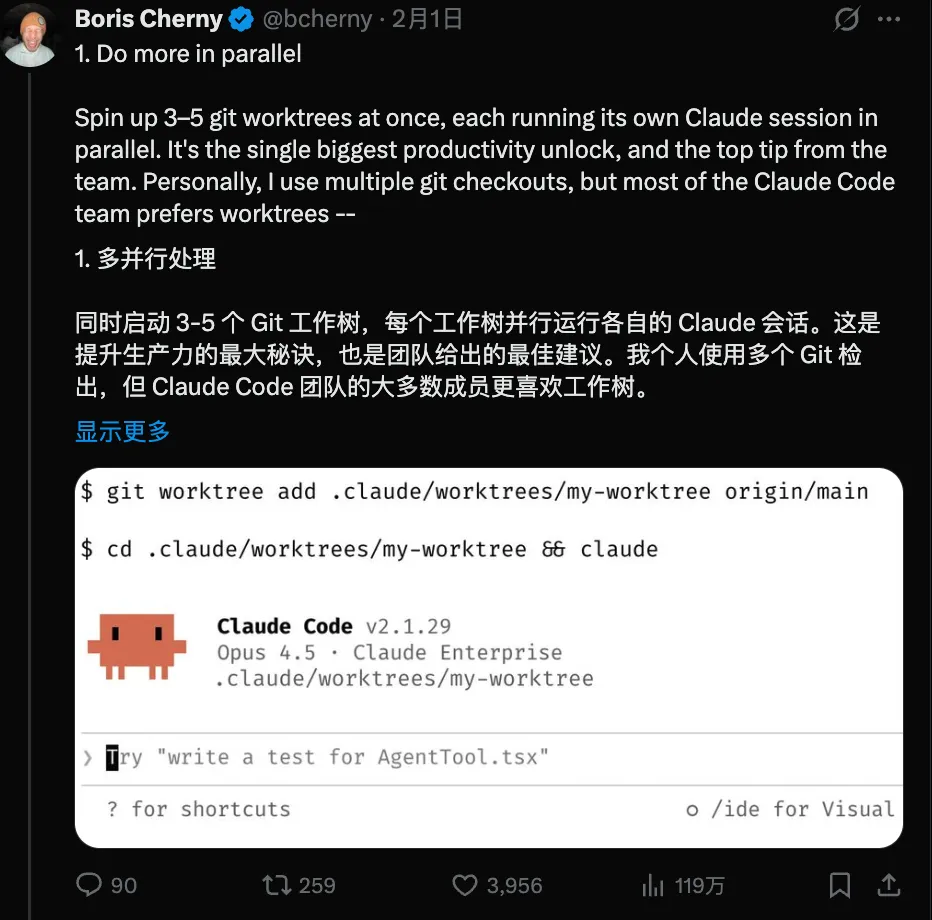 同时开 3–5 个独立的代码目录(用 git worktree 最方便),每个目录里跑一个独立的 Claude 会话。