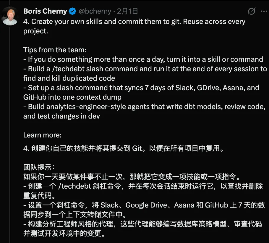 例如 /techdebt(扫描重复代码)、一键拉 7 天 Slack+GitHub 上下文、自动写测试等。