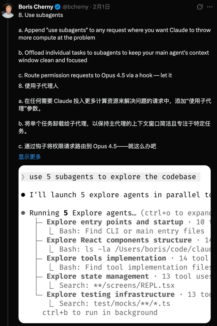 复杂任务后面加一句 “use subagents”,让 Claude 投入更多算力。