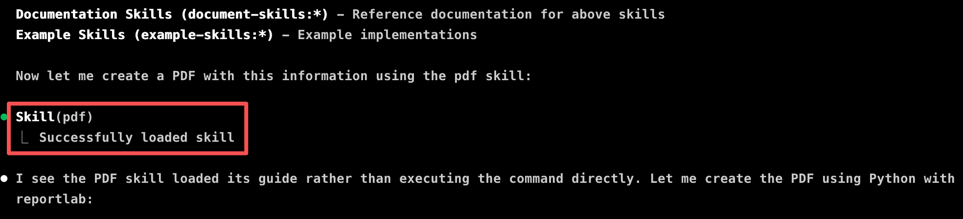 提示词中要创建 PDF,所以它自动加载了 PDF 的 Skill,这就是自动按需加载。