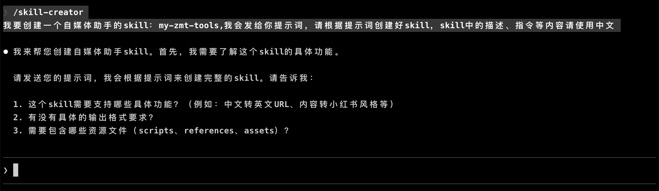 下面,我来演示下如何通过 skill-creator 技能来创建一个自媒体助手 Skills。