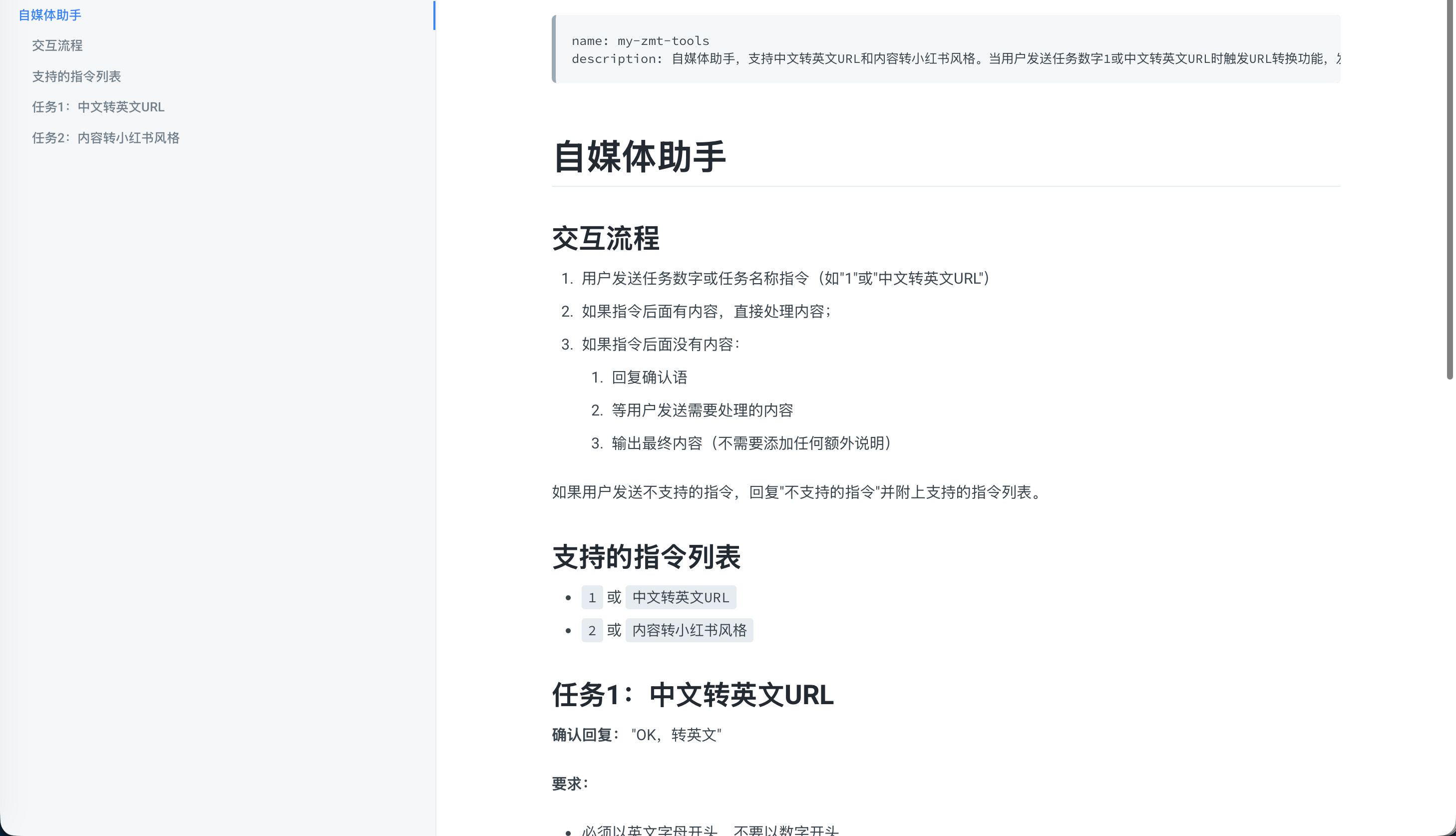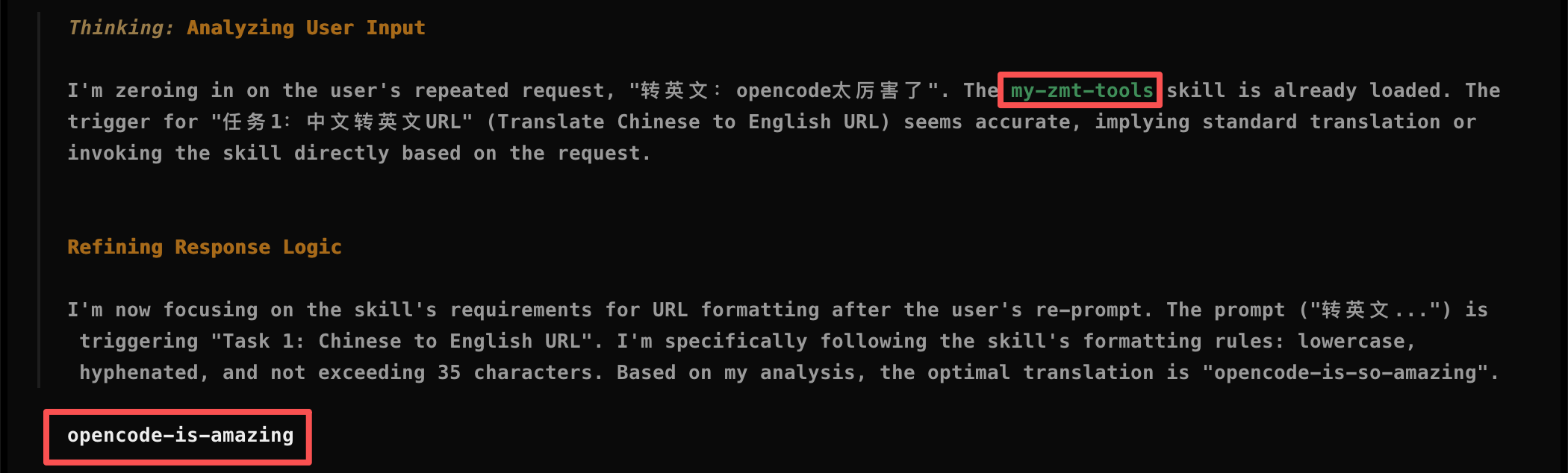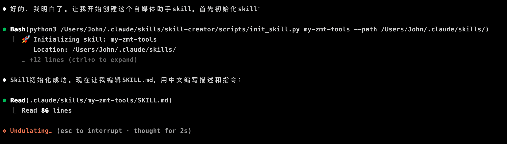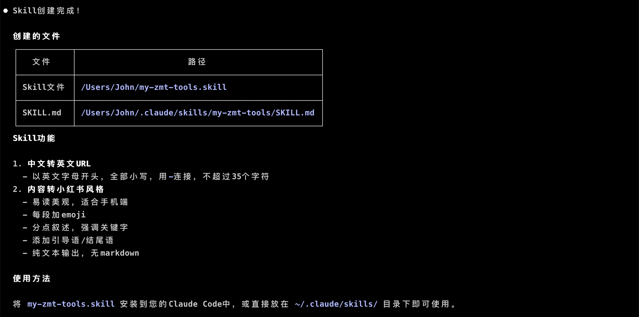 不一会儿,它就帮我在 ~/.claude/skills 目录下创建好了 my-zmt-tools 自媒体助手 Skill,它主要包括两个功能:中文转英文URL、内容转小红书风格,这两个功能我之前是在 GPT 上面实现的。