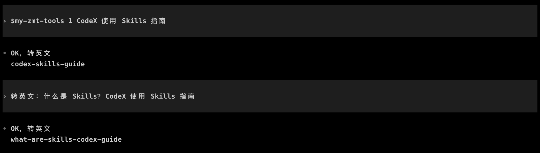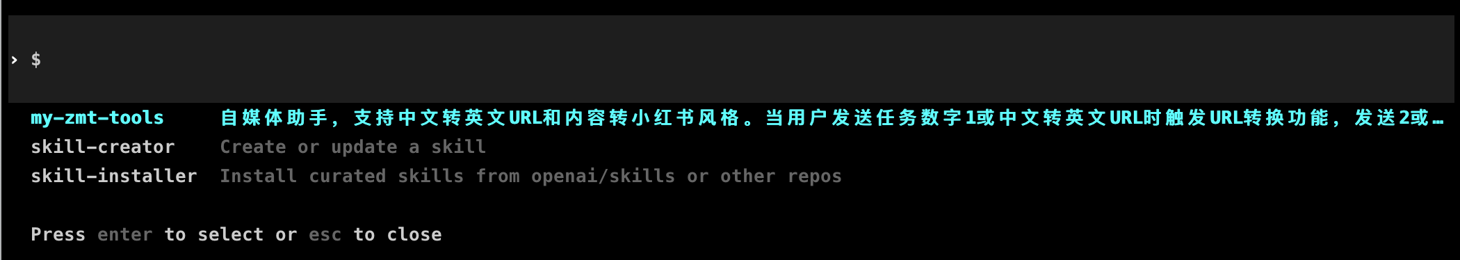 方法很简单,比如,我把上面创建好的 my-zmt-tolls 目录直接复制到 ~/.codex/skills 目录下。