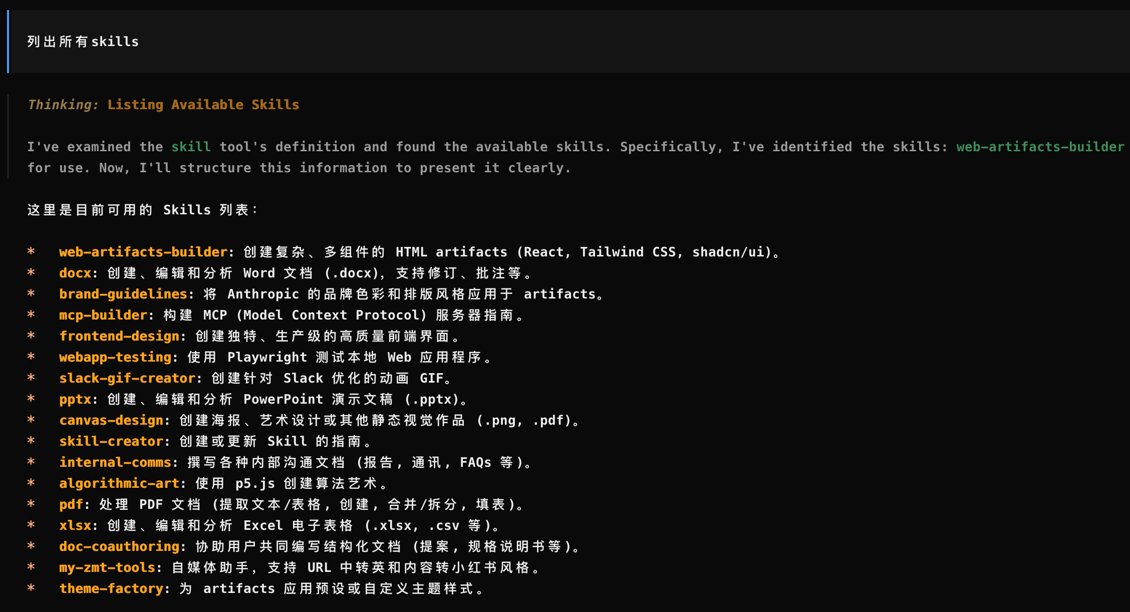 现在来看看如何使用它,直接使用 /my-zmt-tool 技能的指令,然后带上指令参数、具体的内容或者要求就行了: