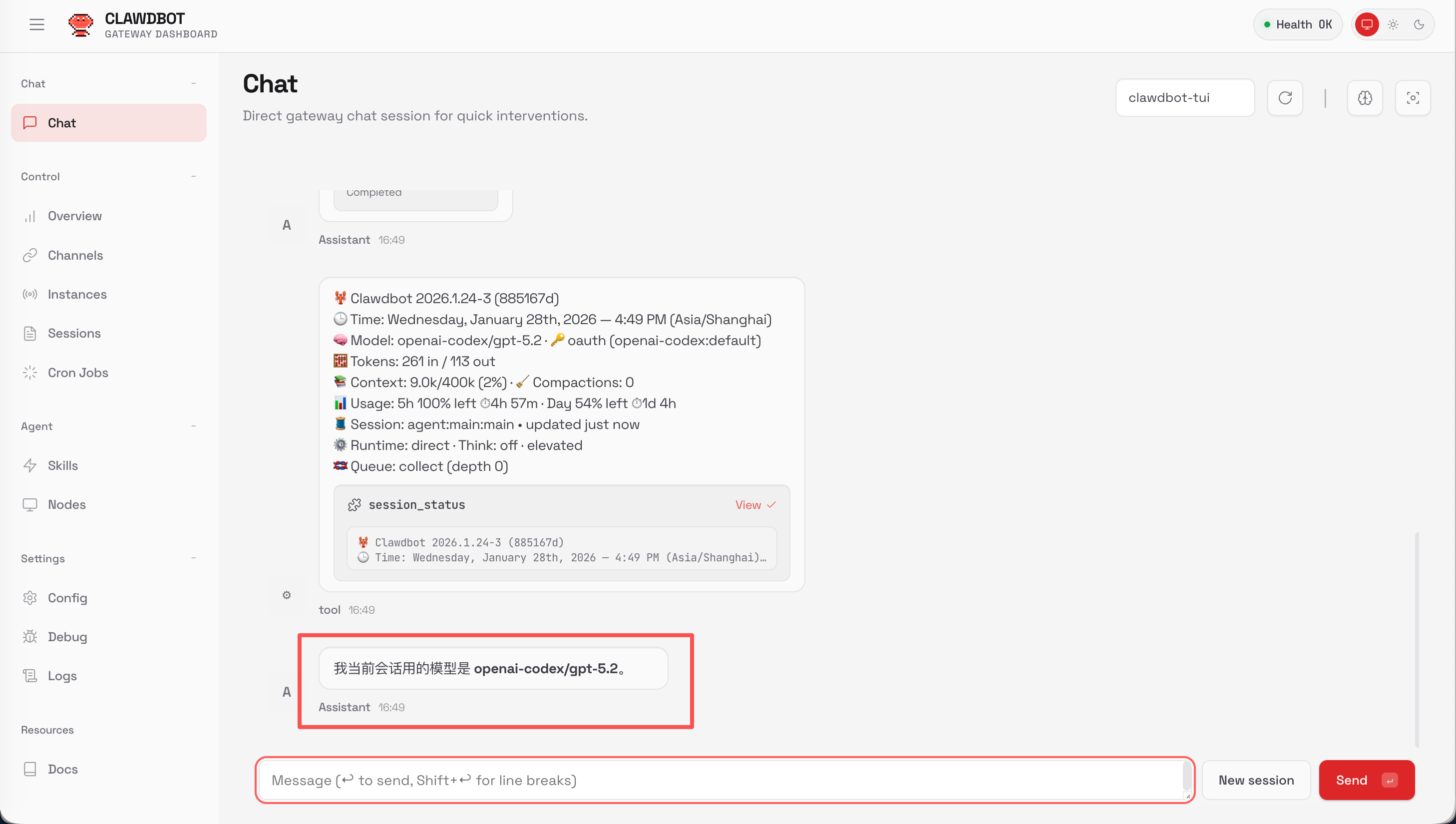 打开后,可以看到 Moltbot 的聊天界面: