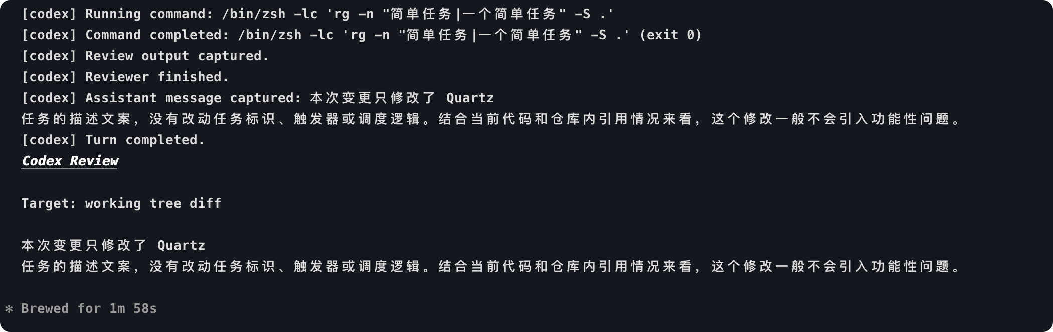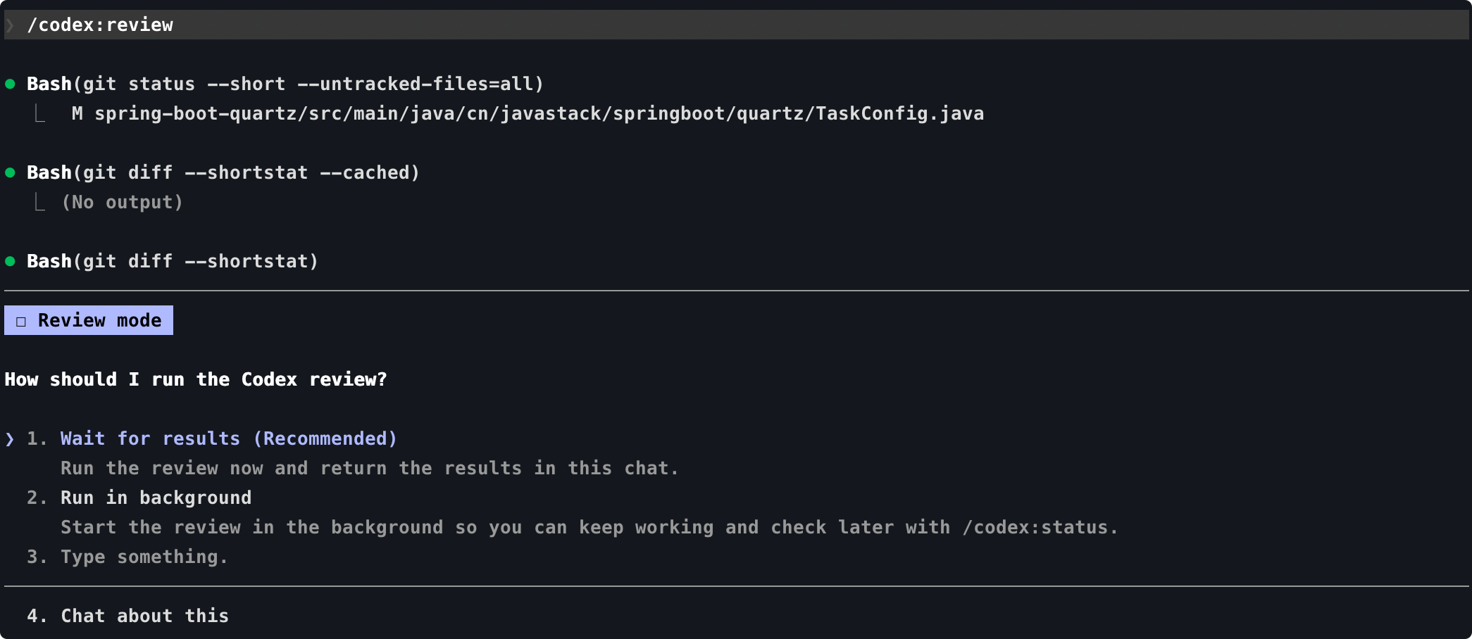 比如我执行 /codex:review,它就会自动分析当前仓库的 git 状态,并使用 Codex 来进行代码审查,如图所示: