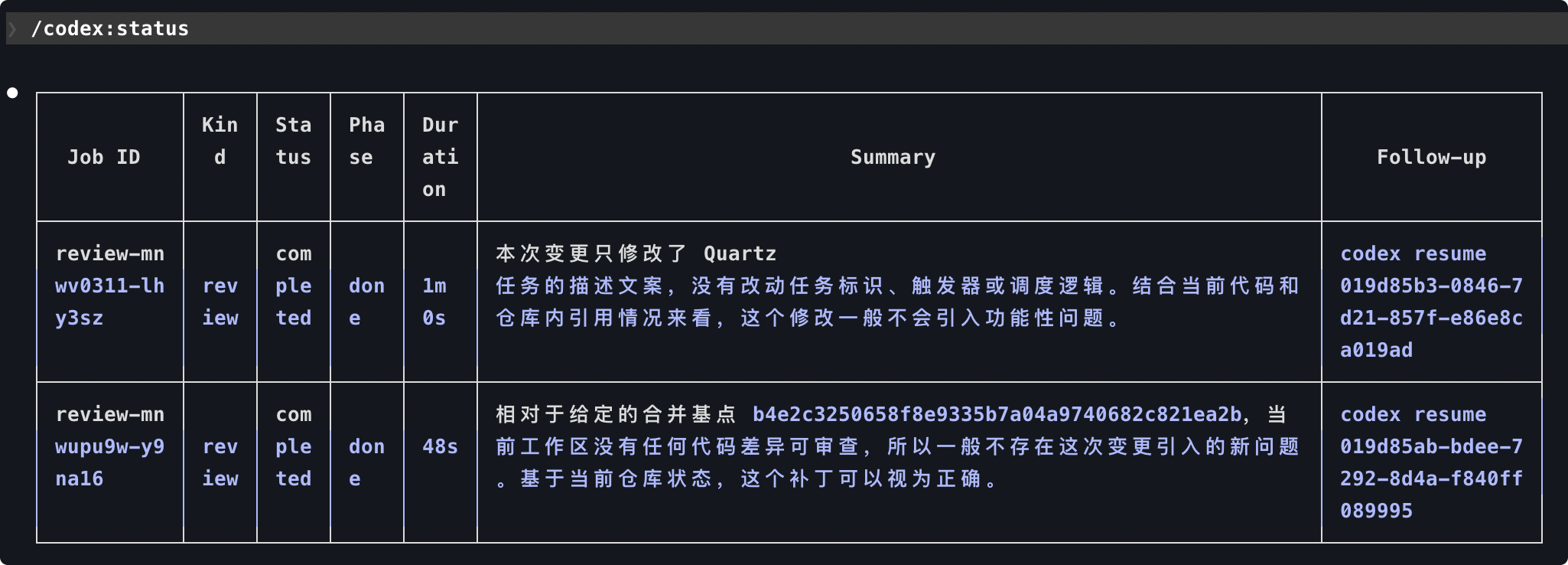 | /codex:status | 查看当前仓库中正在运行和最近的 Codex 任务状态。 |