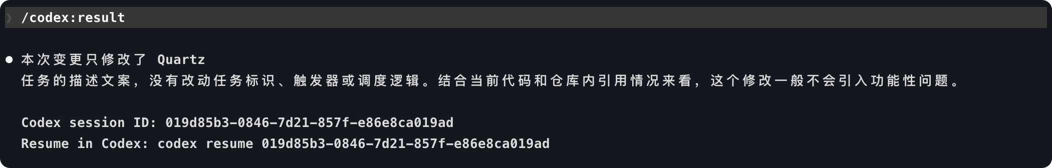 | /codex:result | 查看当前仓库中已完成 Codex 任务保存的最终输出结果。 |