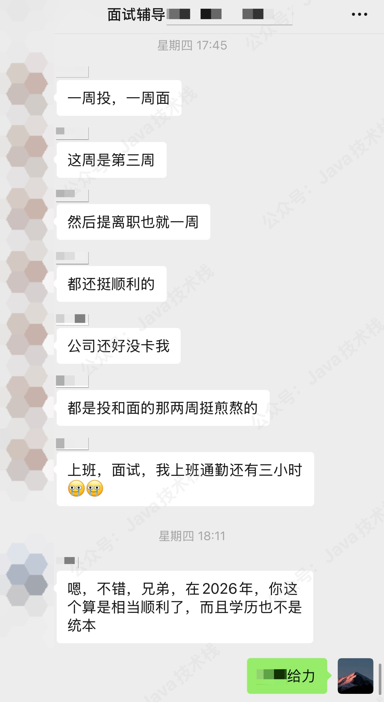 从聊天截图里能看到,他一开始找到我的时候,说自己干 Java 开发 5 年了,最近这家公司也待了几年了,目前感觉公司业务单一,对后边成长也没什么帮助,薪资也不是很高,所以想准备准备,换个工作。