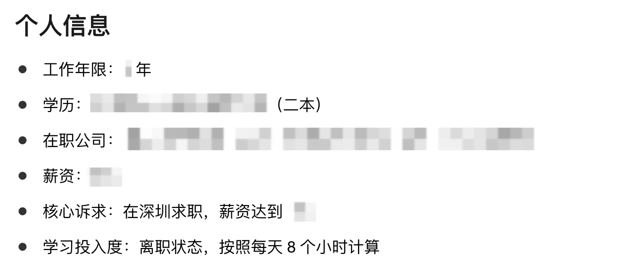 因为他是离职状态,学习时间并不多,所以就需要高效地学习有针对性的内容,完成快速再就业,缩短简历中的空窗期。