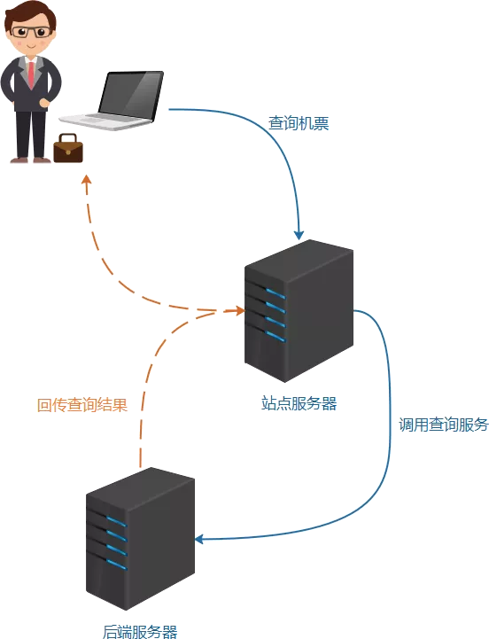 一个用户在页面上发起了一个查询机票的请求。站点服务器接收到请求之后调用了后端的查询机票服务。考虑到这个调用可能会耗时较长,接口上使用了 callback 来回传实际的查询结果。然后再由站点服务器通过类似 WebSocket 的技术推送给客户端。
