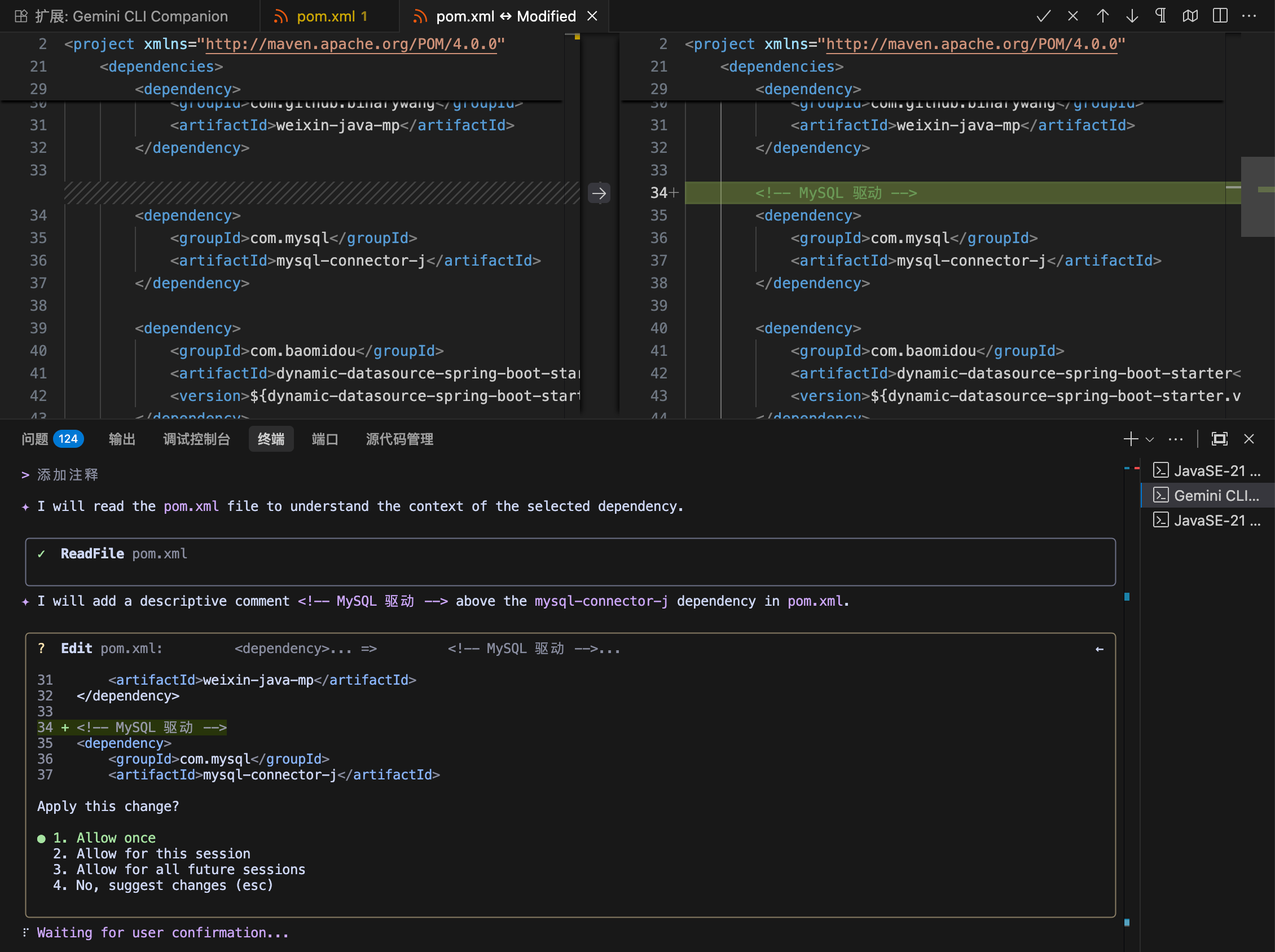 不错,不仅注释添加上了,还会有一个「差异对比」的窗口,这样是不是比在终端使用 Gemini CLI 要方便多了?
