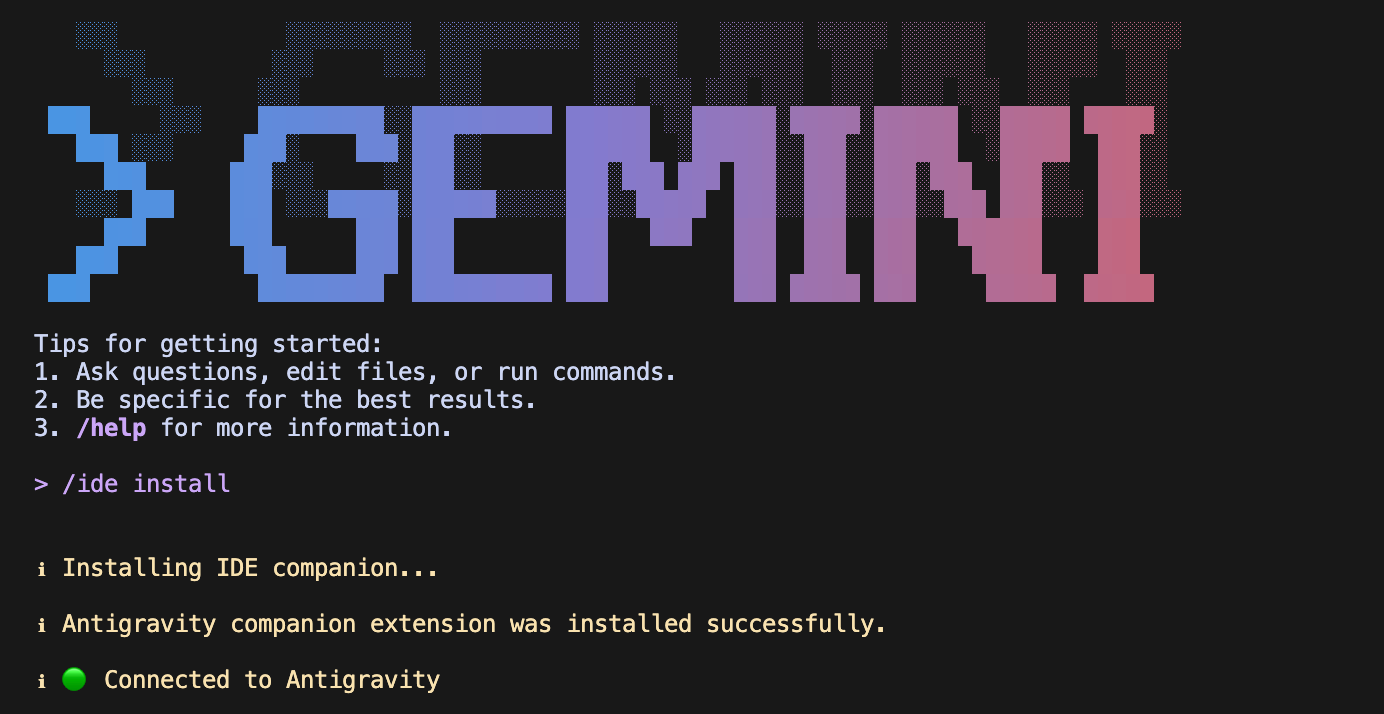 安装完成之后,在终端运行「gemini」就可以了,默认它会安装并启用 Antigravity companion 插件: