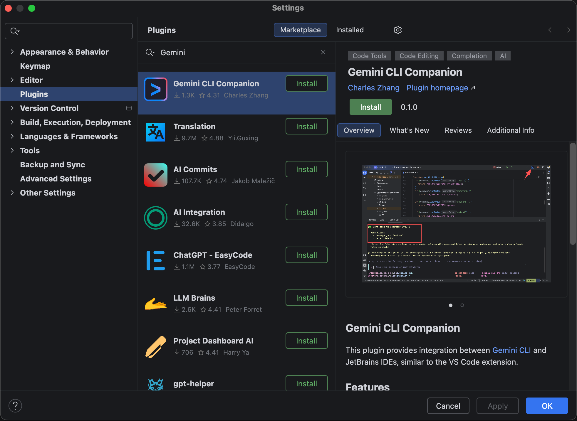 我原来以为只有 VS Code 系才支持 Gemini CLI Companion 插件,没想到在 JetBrains IDEs 中也是支持的,比如我试了「IntelliJ IDEA」和「PyCharm」两个 IDE,都是支持的。