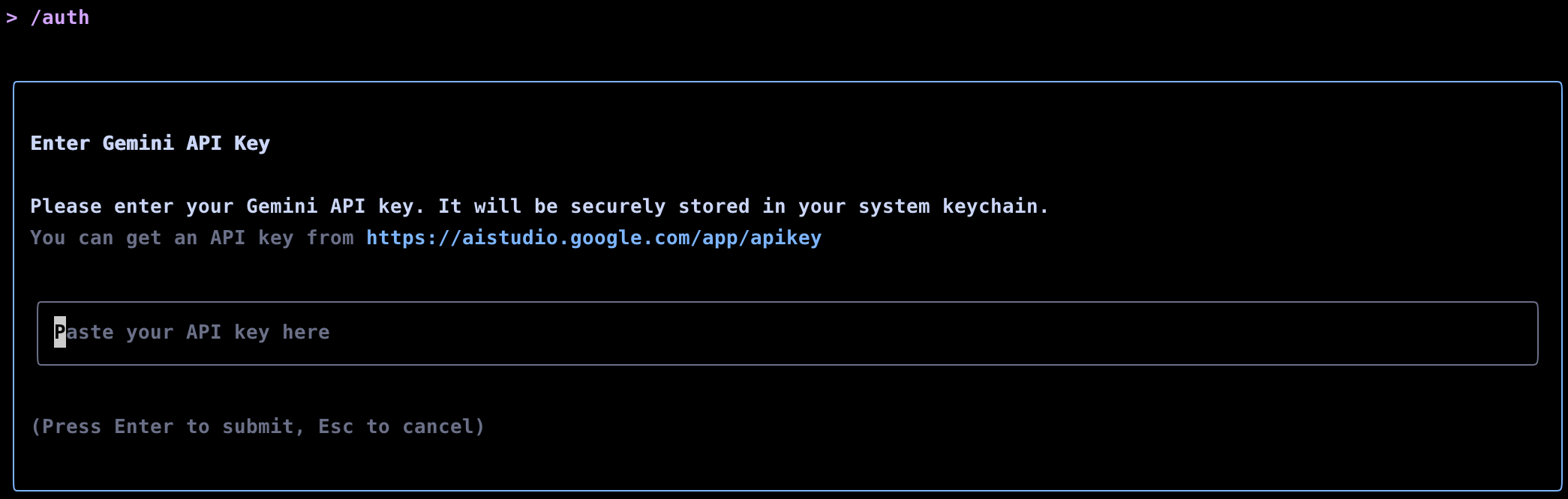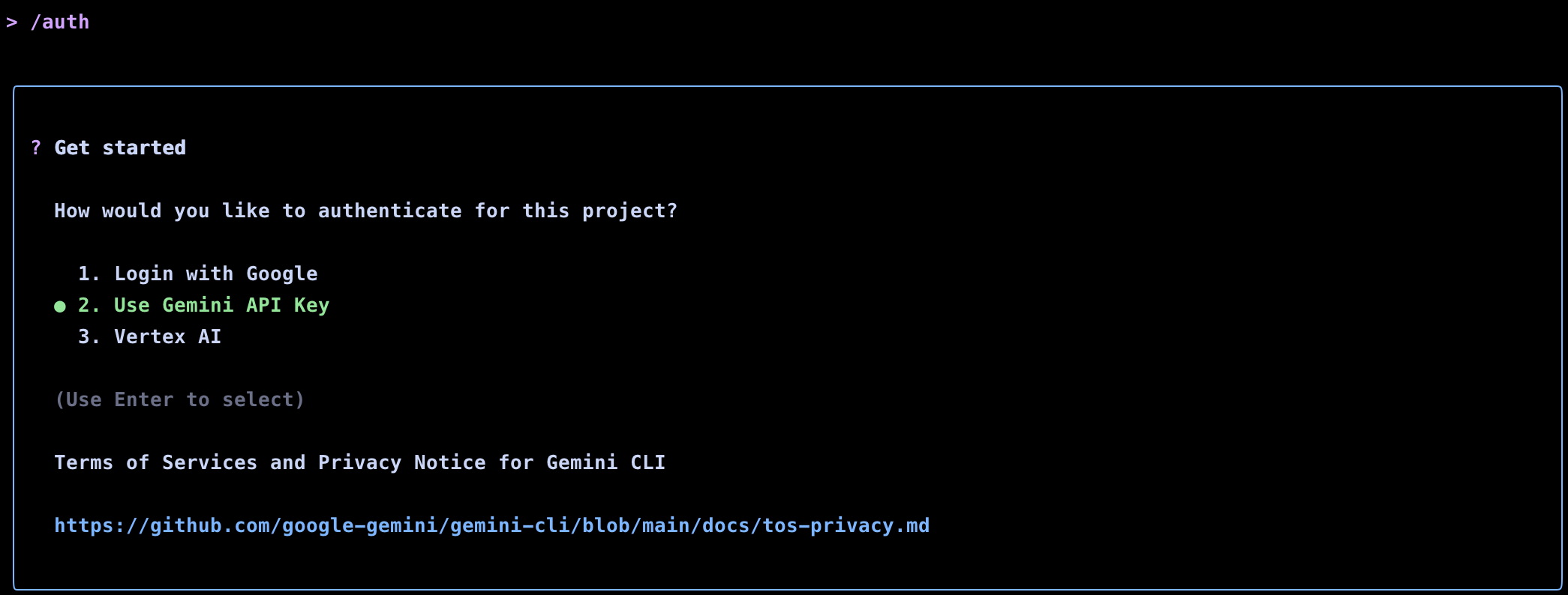 输入上面获取到的 API Key,然后按回车,Gemini CLI 就能使用 API 扣费模式了。