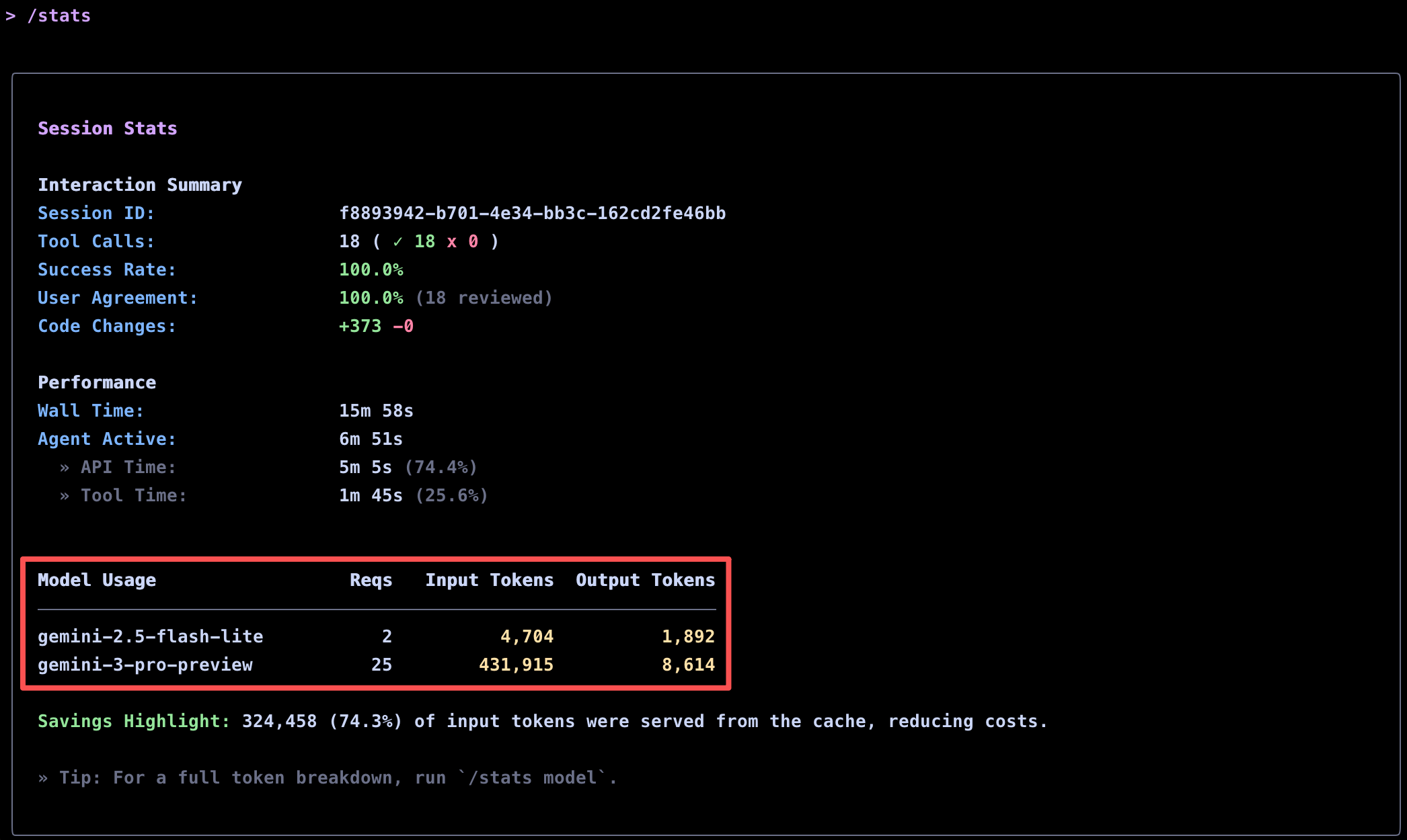 使用 /stats 命令可以查看本次会话的 tokens 使用情况: