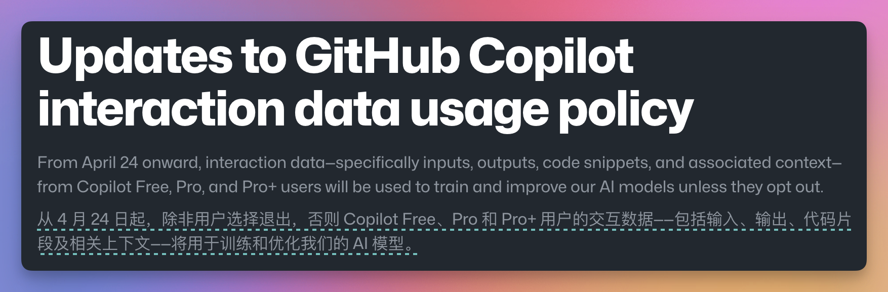 GitHub Copilot 宣布自 4 月 24 日起,将使用个人交互数据来训练大模型,被用于训练大模型的交互数据包括输入、输出、代码片段及相关上下文。