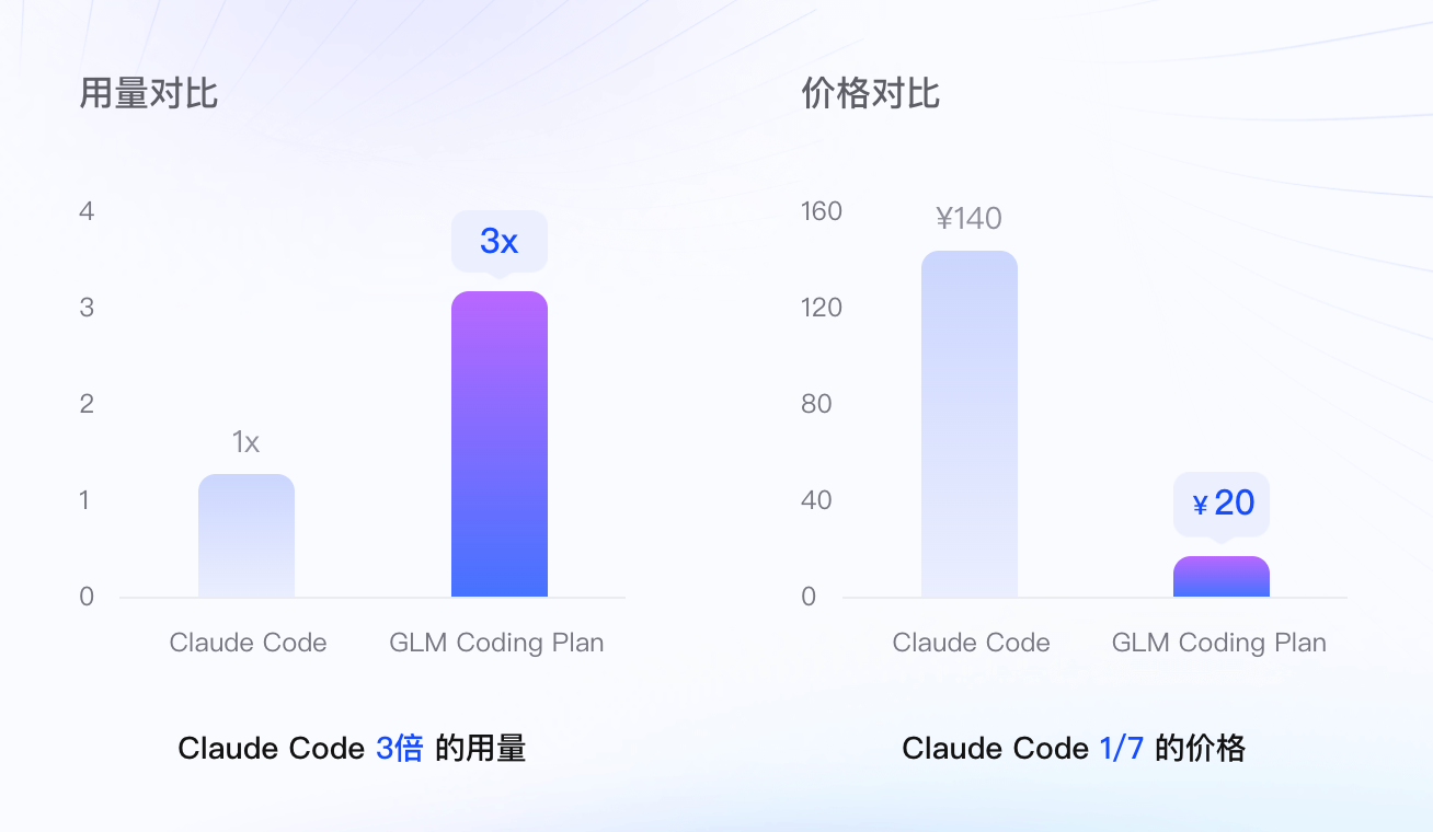 它的价格竟然是 Claude Code 的 1/7,超过 Claude Code 3 倍的用量,如果订阅 GLM Coding Plan,套餐低至 20 元/月,192 元/年,性价比拉满,不能太强了。