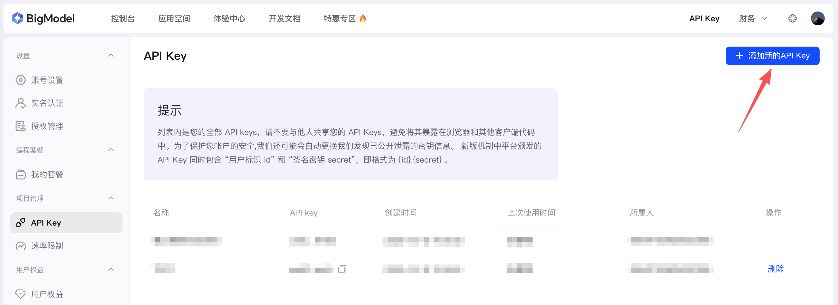 注册一个账号并进行登录,然后进入 API Key 页面创建一个 API Key,如图所示: