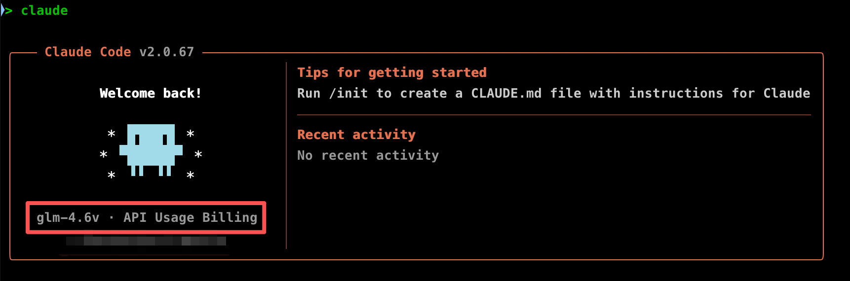 信息栏显示的是 glm-4.6v · API Usage Billing,这样就能基于 Claude Code 来使用智谱 GLM-4.6V API 编程了。