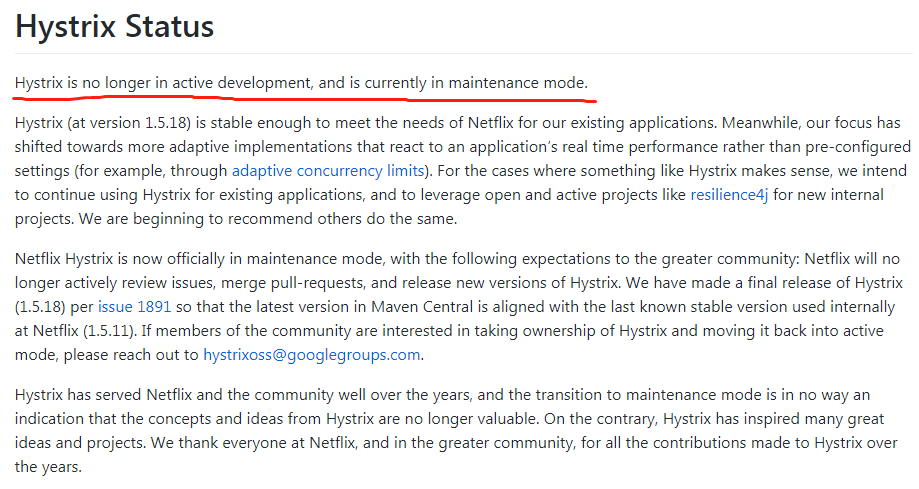 Hystrix 不再继续开发了,目前的稳定版本 1.5.18 已经足够满足现有应用对 Hystrix 的需求。