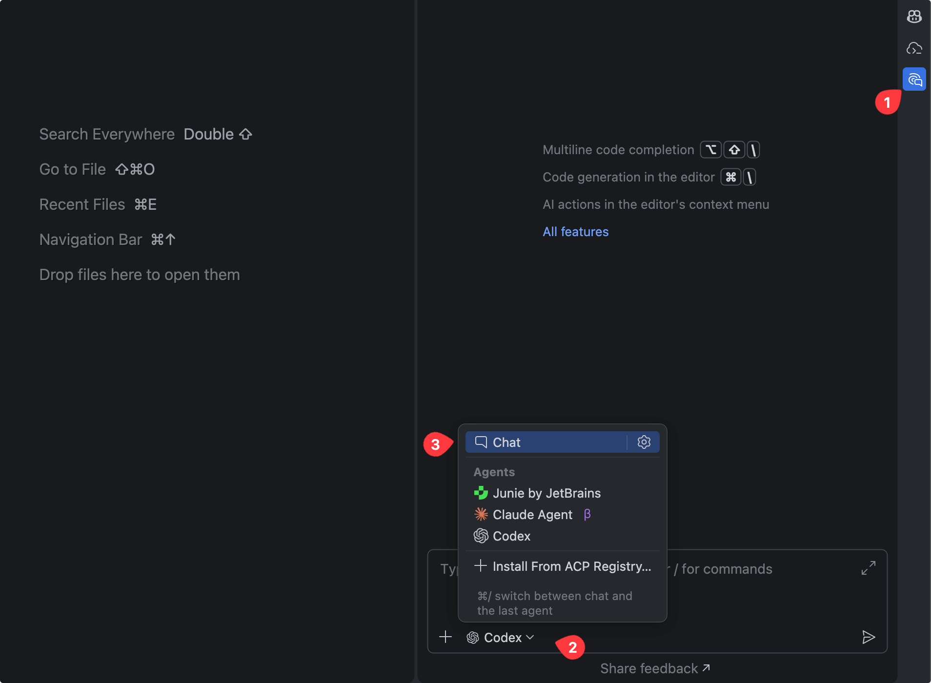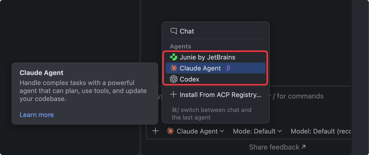 安装完成之后,在 AI Chat 面板中选择要使用的 Agent: