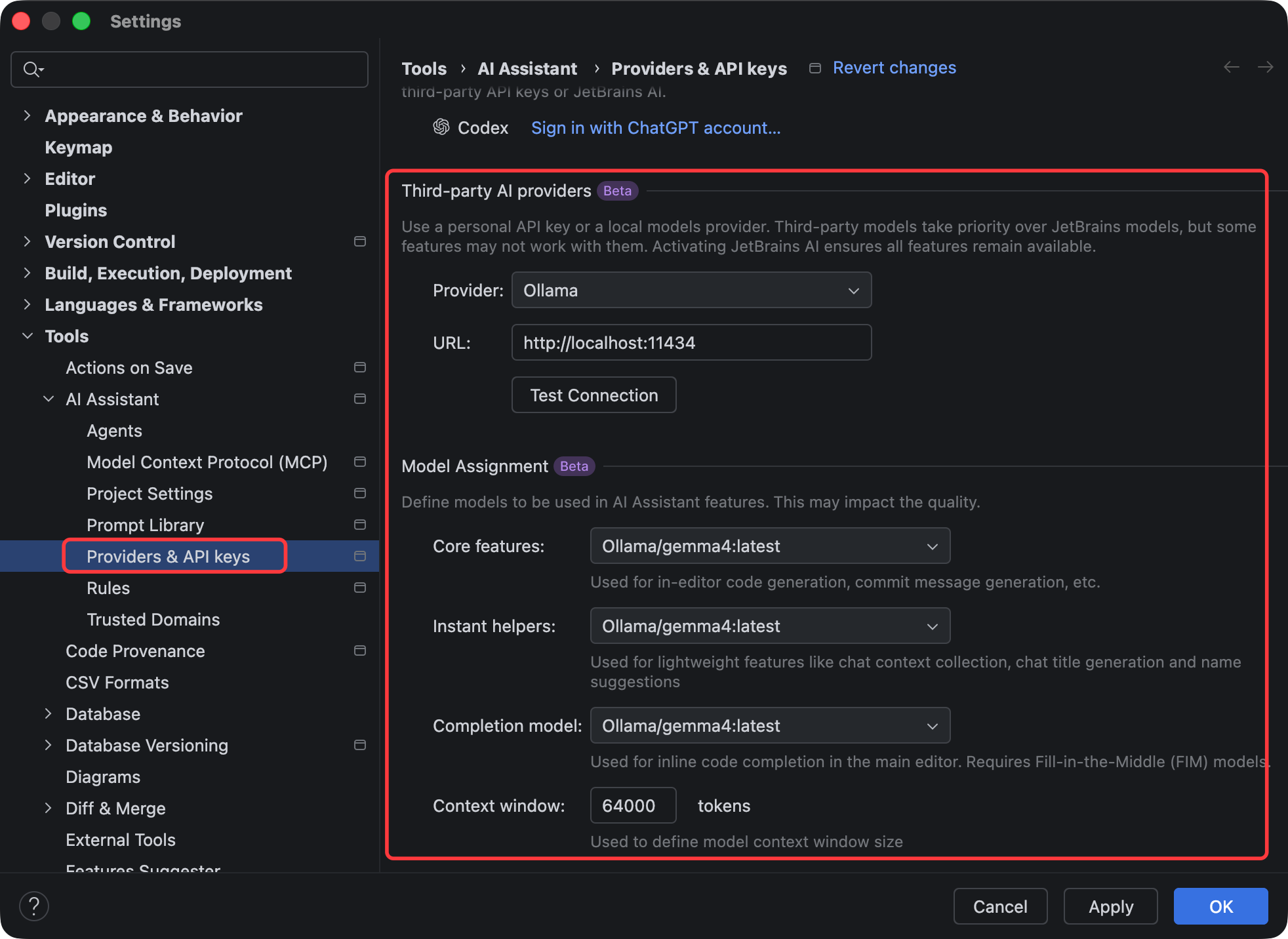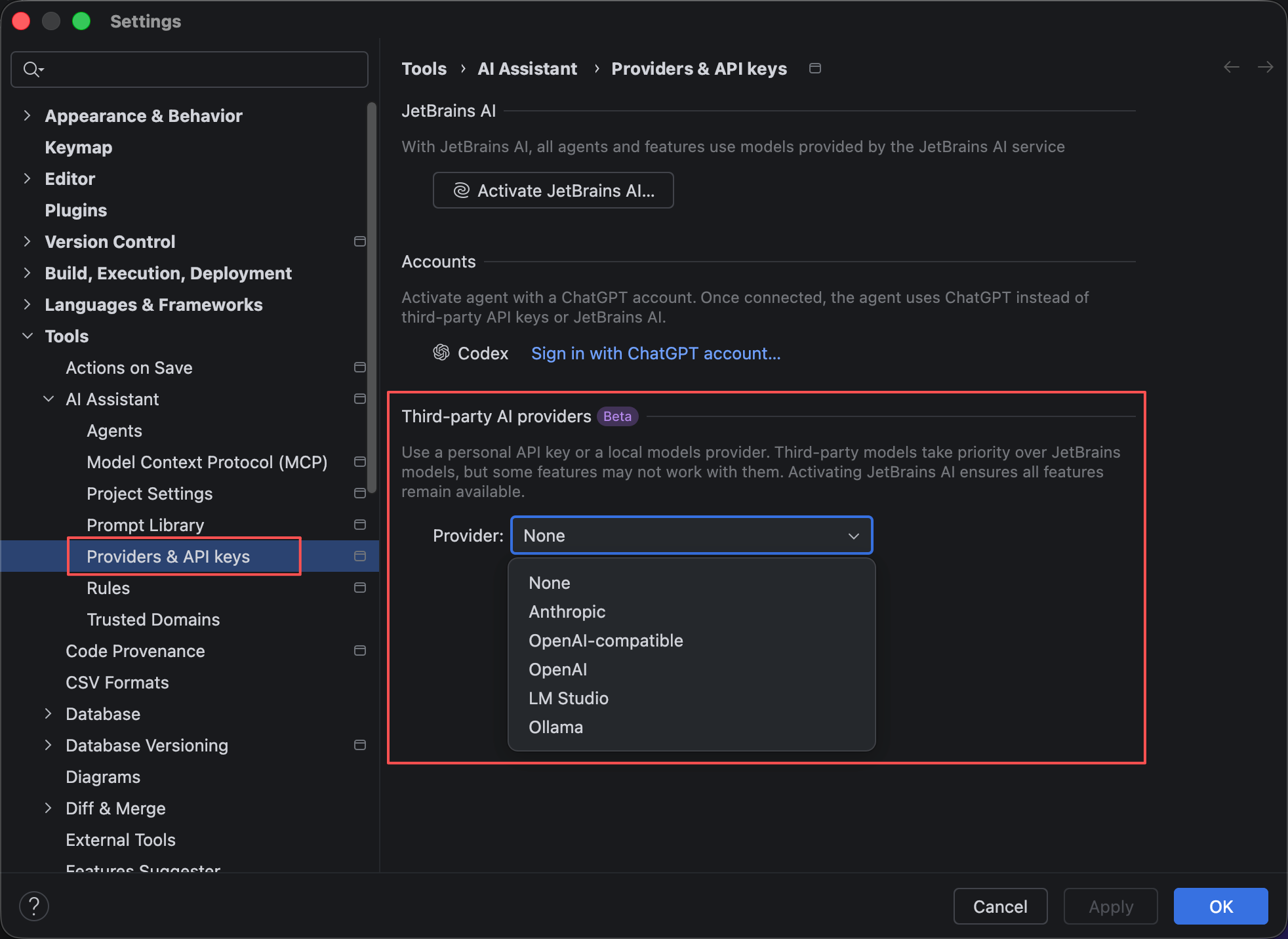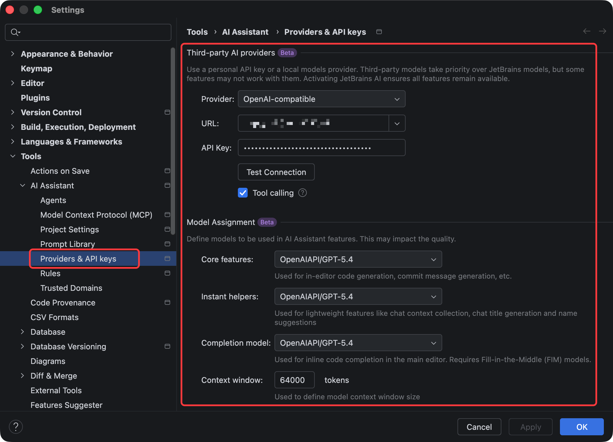 进入 IDEA 的 Settings – Tools – AI Assistant – Providers & API keys 界面: