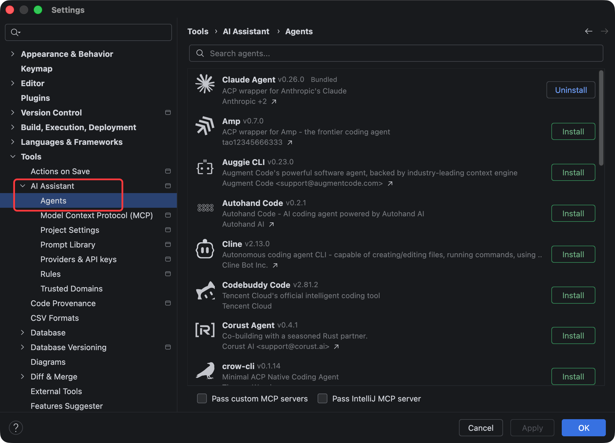 进入 IDEA 的 Settings – Tools – AI Assistant – Agents 界面: