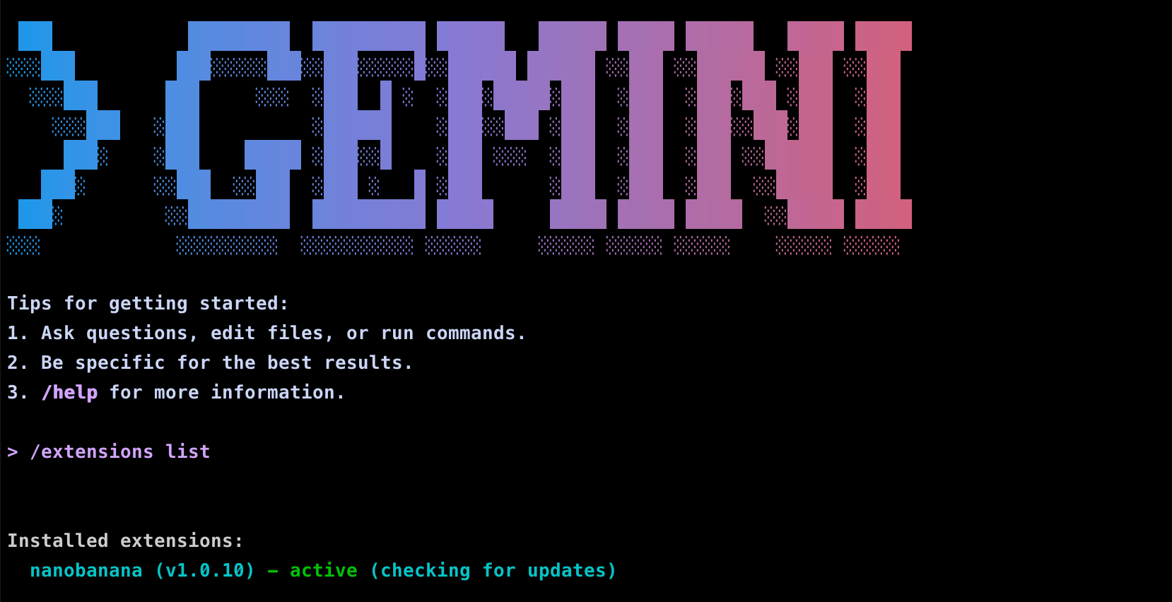 安装完成后,退出之前的 Gemini CLI 会话,重新开一个 Gemini CLI 会话,然后使用 /extensions list 命令查看已经安装好的插件。