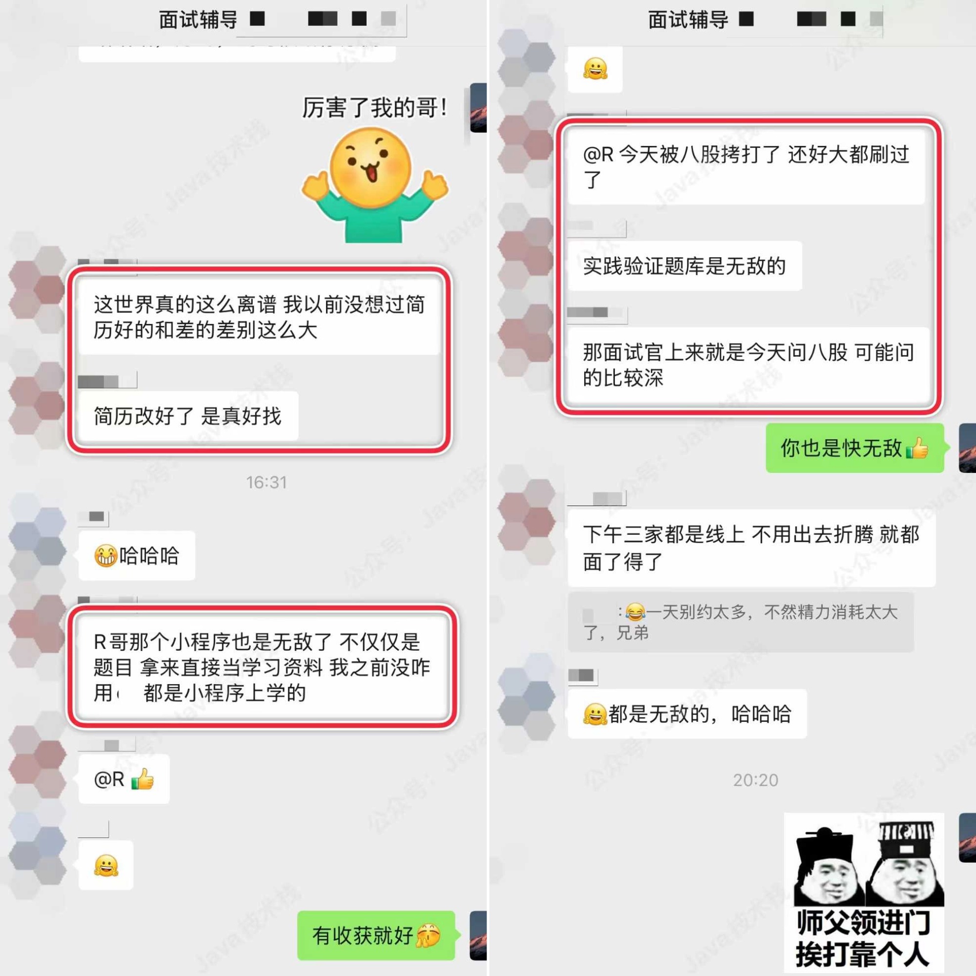 我们的面试辅导,从模拟面试摸底、定制学习计划、专项学习资料、技术指导、简历优化、真实面试场景问题辅导、再到面试复盘、求职指导……,全链路服务,专为后端面试打造。