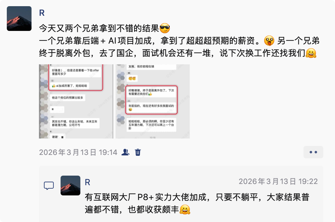 如果你也想在 AI 赋能的时代,抓住跳槽涨薪的黄金机会,欢迎加入我们的面试辅导,我们会帮你系统、全面地掌握 Java + AI 的核心技能,助你在面试中脱颖而出。