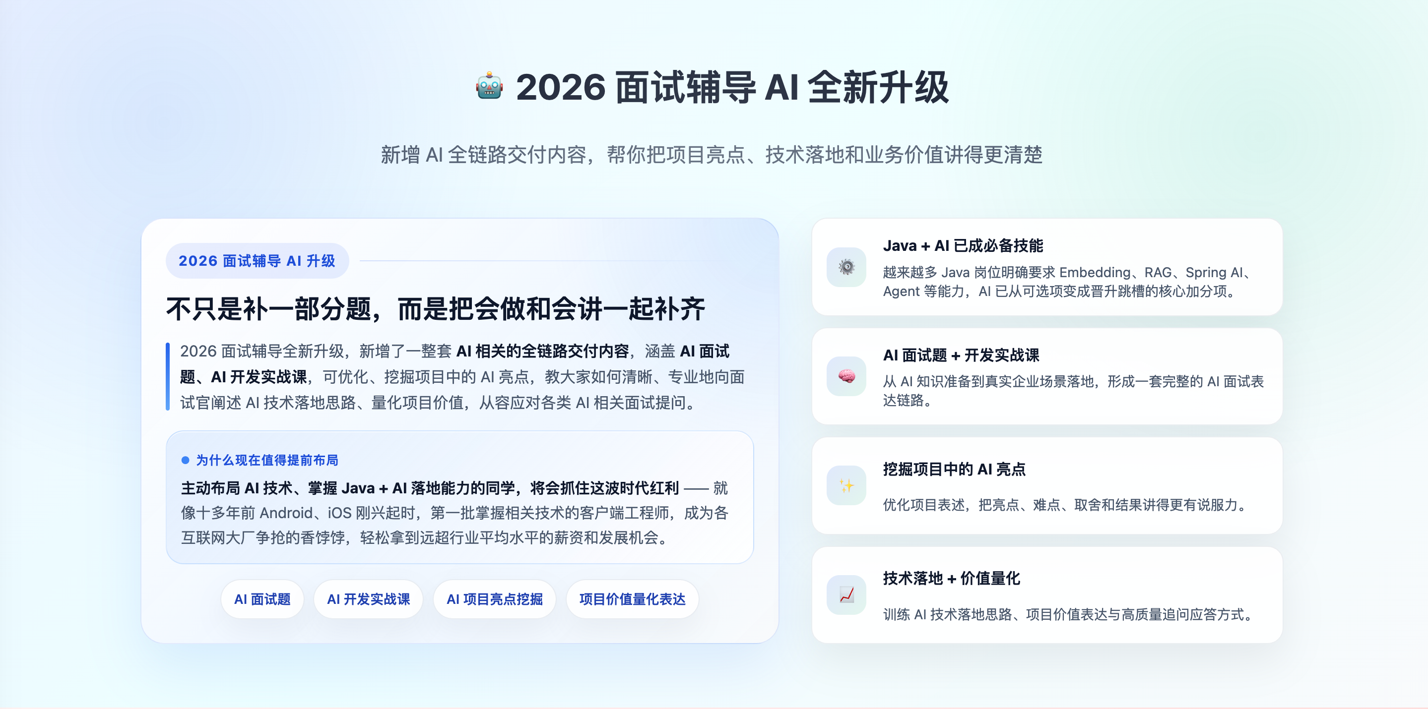 面试辅导新增了一整套 AI 相关的全链路交付内容,涵盖 AI 面试题、AI 开发实战课,可优化、挖掘项目中的 AI 亮点,教大家如何清晰、专业地向面试官阐述 AI 技术落地思路、量化项目价值,从容应对各类 AI 相关面试提问。