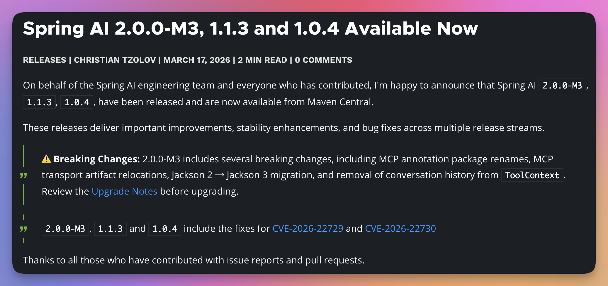 除了 Spring AI 1.1.3,2.0.0 也来到了 M3 版本了,相信再过一阵子就要正式 GA 了,1.0.4 也发布了,大家可以根据自己的需要选择合适的版本。